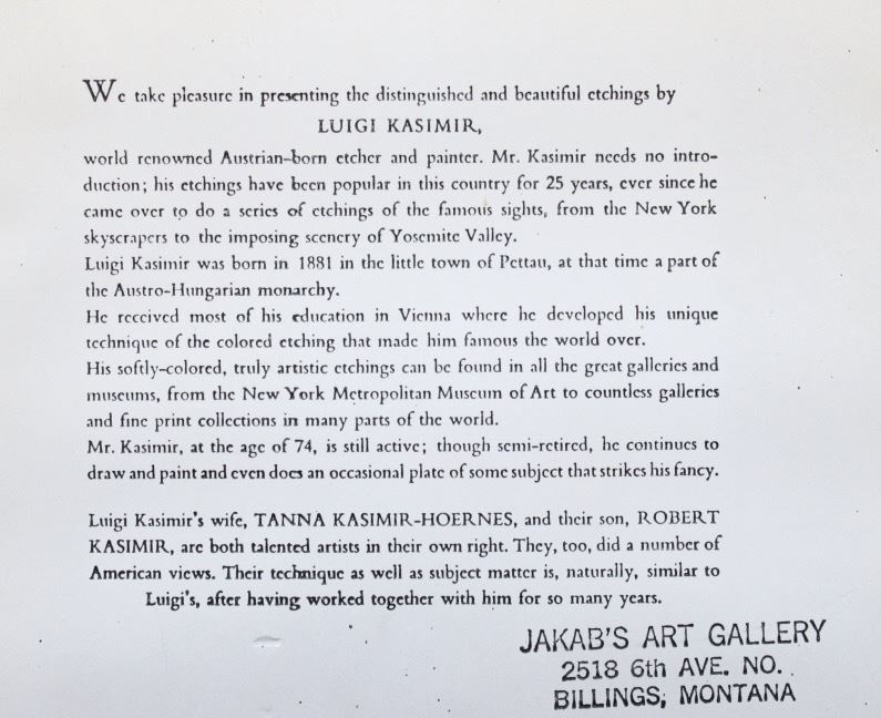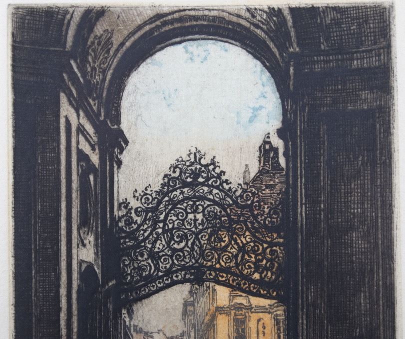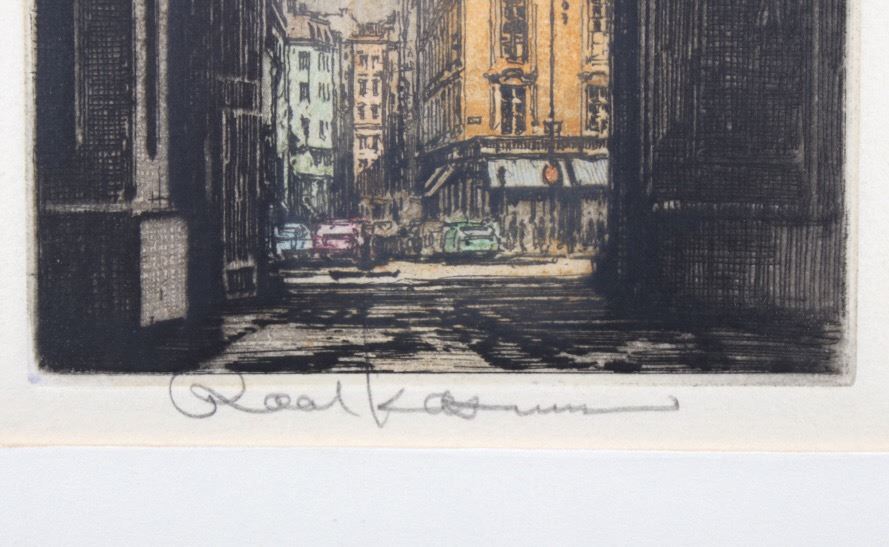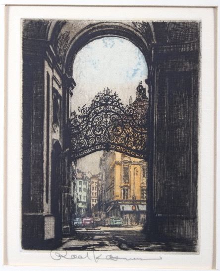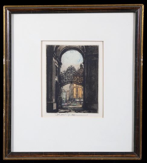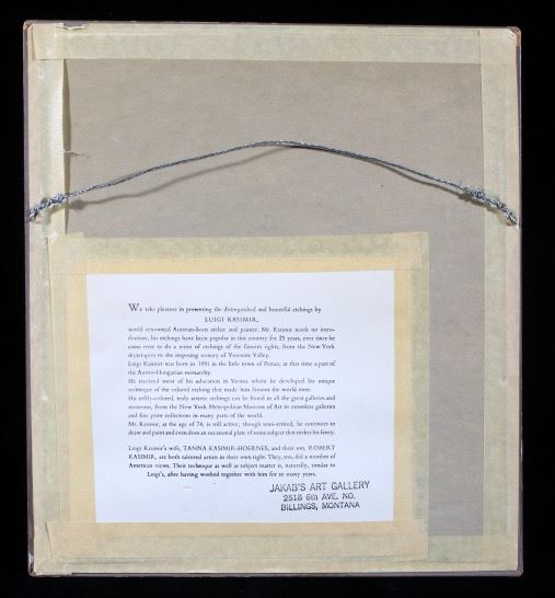 Offered in this lot we have a colored etching of an arched gateway by Robert Kasimir. Kasimir (1914- 2002) is a well known is a Austrian born artist known for his detailed cityscapes and landscape etching as well as his skill in multi-plate colored etchings. The etching shows the image of a open ornate gate underneath a stone archway with a colorful street just beyond the gate. The piece shows wonderful color and detail with excellent contrast between the arch and street that draws the eye. The etching is signed by Robert Kasimir across the bottom of the piece. The piece is set into a gold painted frame with a info tag on the back from Jakab's Art Gallery located in Billings, Montana. This colored etching shows good condition overall. The frame measures 10 1/4" wide by 11 1/2" tall with the etching measuring 4 1/2" wide by 5 3/4" tall.