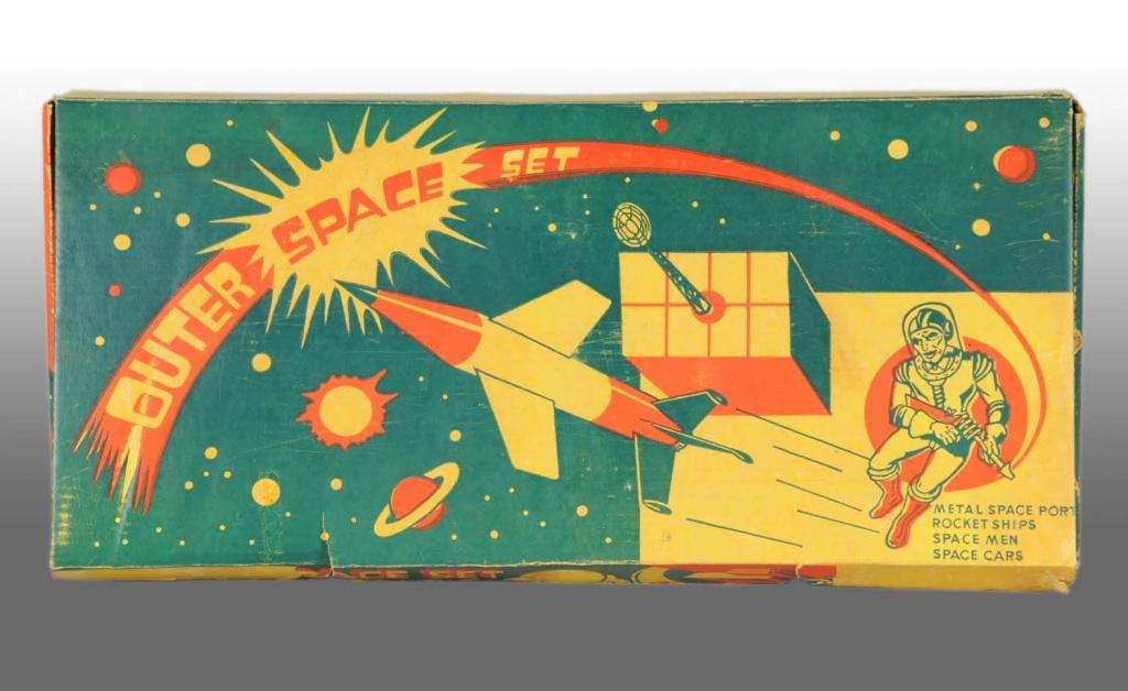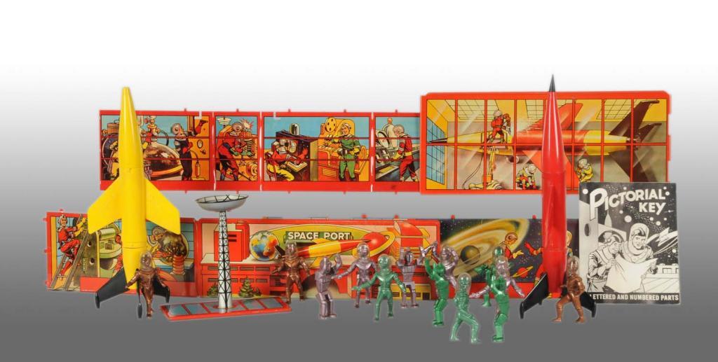 American. Made by Archer Plastics in New York. Extremely scarce. Beautiful lithographed graphics of a spaceman holding a rifle and missiles in outer space on all sides of box. Includes lithographed metal building parts of an observation tower, space port, launching platform, roof and tower roof. Set also includes assorted missiles and spacemen, some with and without plastic domes and/or holding guns, as well as the original box and instruction booklet. Appears to be mostly complete but has been used and building was put together as well as taken apart. Condition (Very Good). Size 12" x 26".