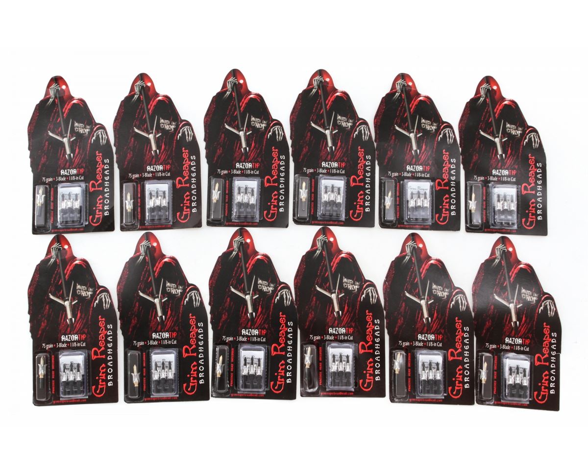 Archery: Twelve (12) Packages of Grim Reaper Razor-Tip Arrowheads, 75 grain, 3-blade, 1-1/8'' cut. Practice head included in each. Retails @ $500/lot. Est.: $250-$350/lot. (Field Time)
