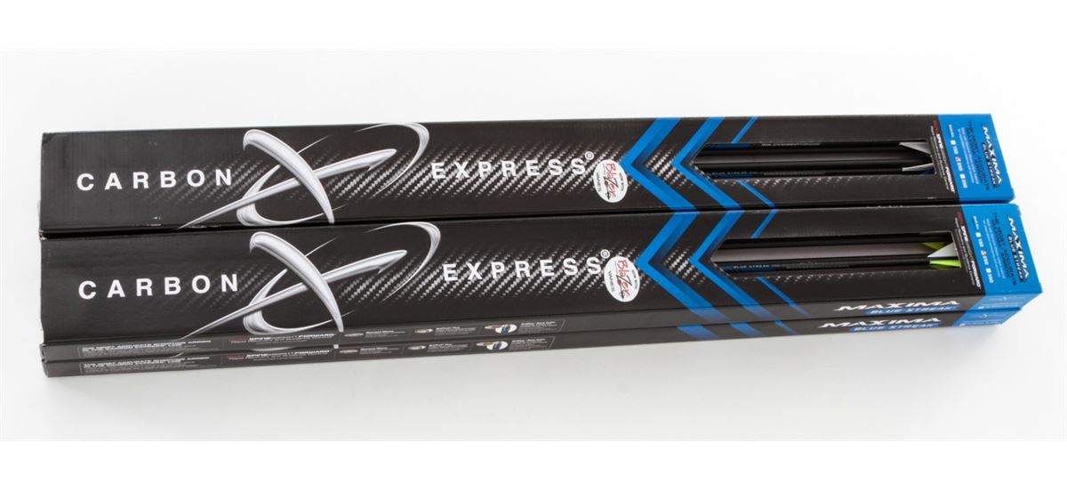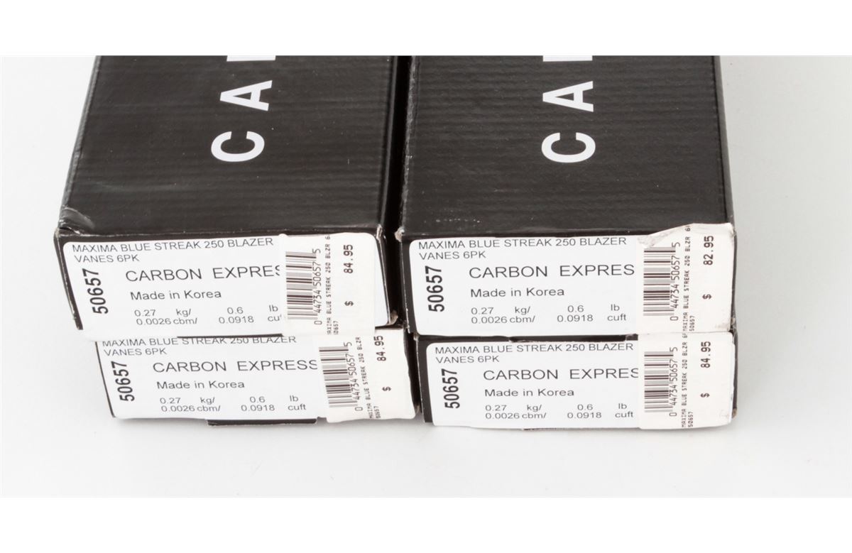 Archery: Four (4) Boxes of Maxima Blue Streak Carbon Express Arrows, each box containing six 250 Blazer vane arrows. All brand new in original boxes. Retails @$370/lot. Est.: $200-$250/lot. (Field Time)
