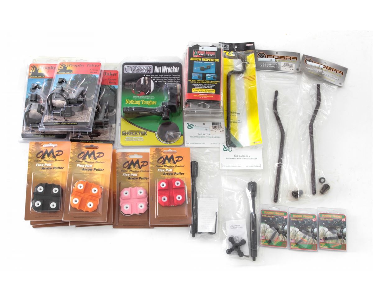 Archery: Three (3) Trophy Taker Arrow Rests; Copper John Rut Wrecker; nine (9) October Mountain Products Flex-Pull Arrow Pullers; three (3) Pine Ridge Arrow Inspectors; two (2) bow string silencers; three (3) cable rod guards; three (3) Dead-On Rangefinders. All brand new in original packaging. Retails @ over $450/lot. Est.: $200-$300/lot. (Field Time)