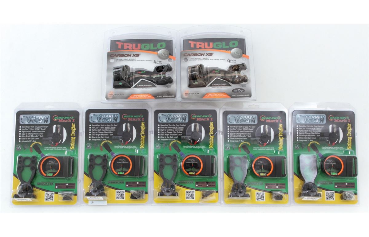 Archery: Lot of Five (5) Copper John Dead Nuts Mark I Archery Sights; along with two (2) TruGlo Carbon XS Lightweight Carbon Composite Archery Sights. All brand new in original packaging. Retails @ $400/lot. Est.: $250-$350/lot. (Field Time)