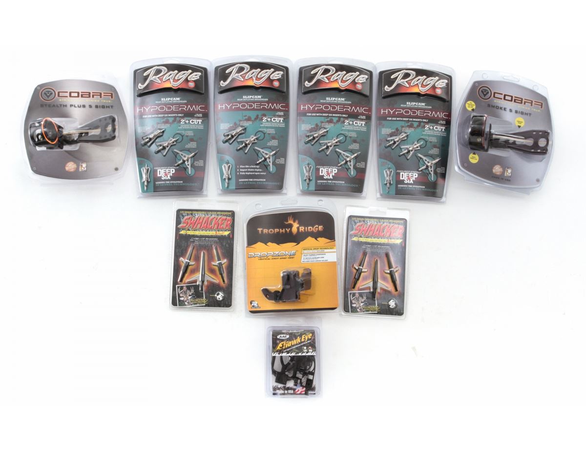 Archery: Lot of Two (2) Cobra Strike 5 Sights; four (4) Rage Slipcam rear deploying hypodermic Broadheads; one Trophy Ridge Dropzone Vertical Dropaway Rest; one AAE HawkEye full-capture limb driven flal-away rest; and two (2) packages of Swhacker 125 grain expandable 2-blade boradheads. All brand new in original packaging. Retails @ over $475/lot. Est.: $250-$350/lot. (Field Time)