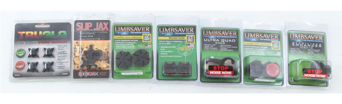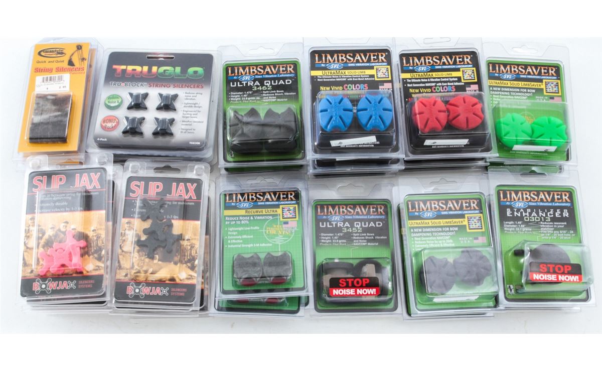 Archery: TruGlo, Slip Jax and Tarantula String Silencers; LimbSaver Recurve Ultras, UltraMaxs, Ultra Quad 3452s, and Stabilizer Enhancers. All brand new in original packaging. Retails @ over $400/lot. Est.: $125-$225/lot. (Field Time)
