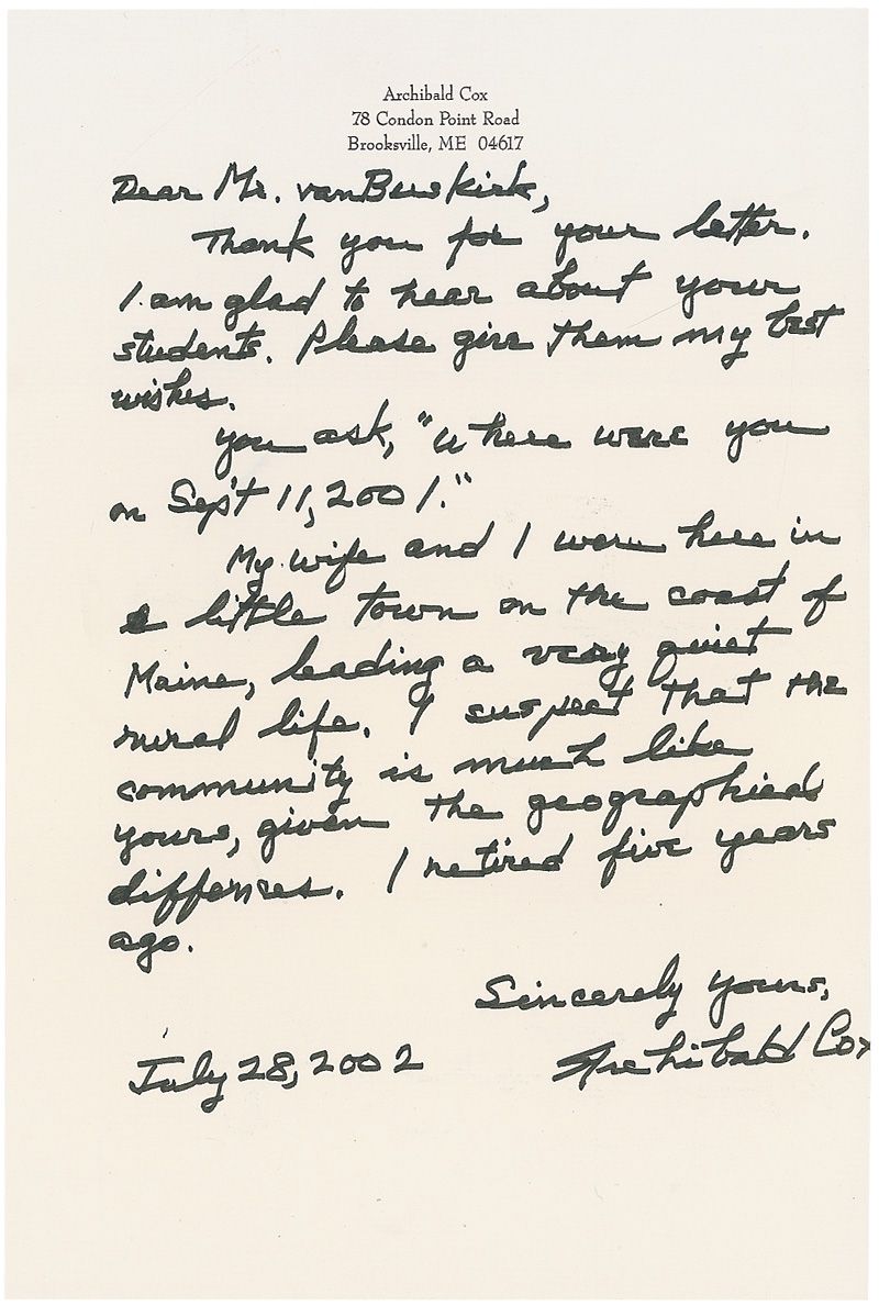 ALS, one page, 7.25 x 10.75, personal letterhead, July 28, 2002. A response to a middle school teacher. In part: “You ask, ‘where were you on Sep’t 11, 2001.’ My wife and I were here in a little town on the coast of Maine, leading a very quiet rural life. I suspect that the community is much like yours, given the geographical differences. I retired five years ago.” In fine condition, with the last letter of the signature running slightly off the page.