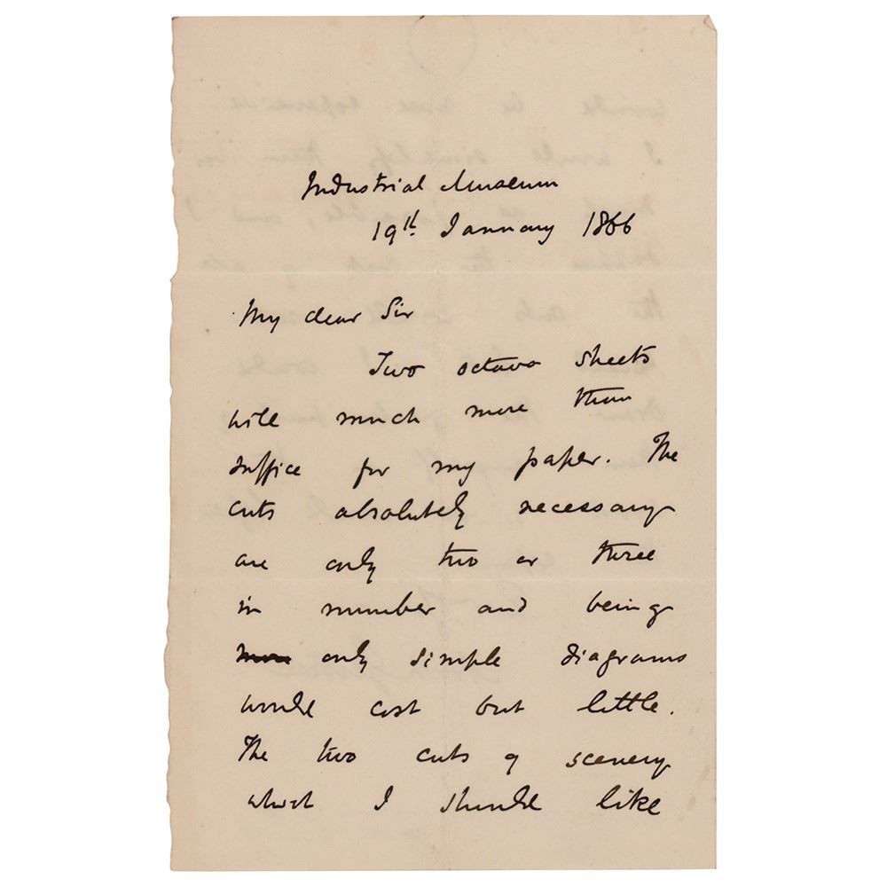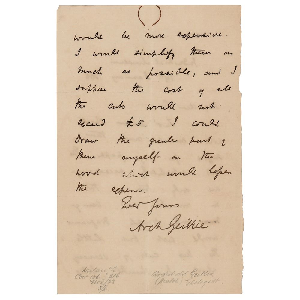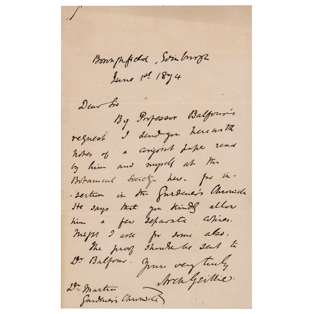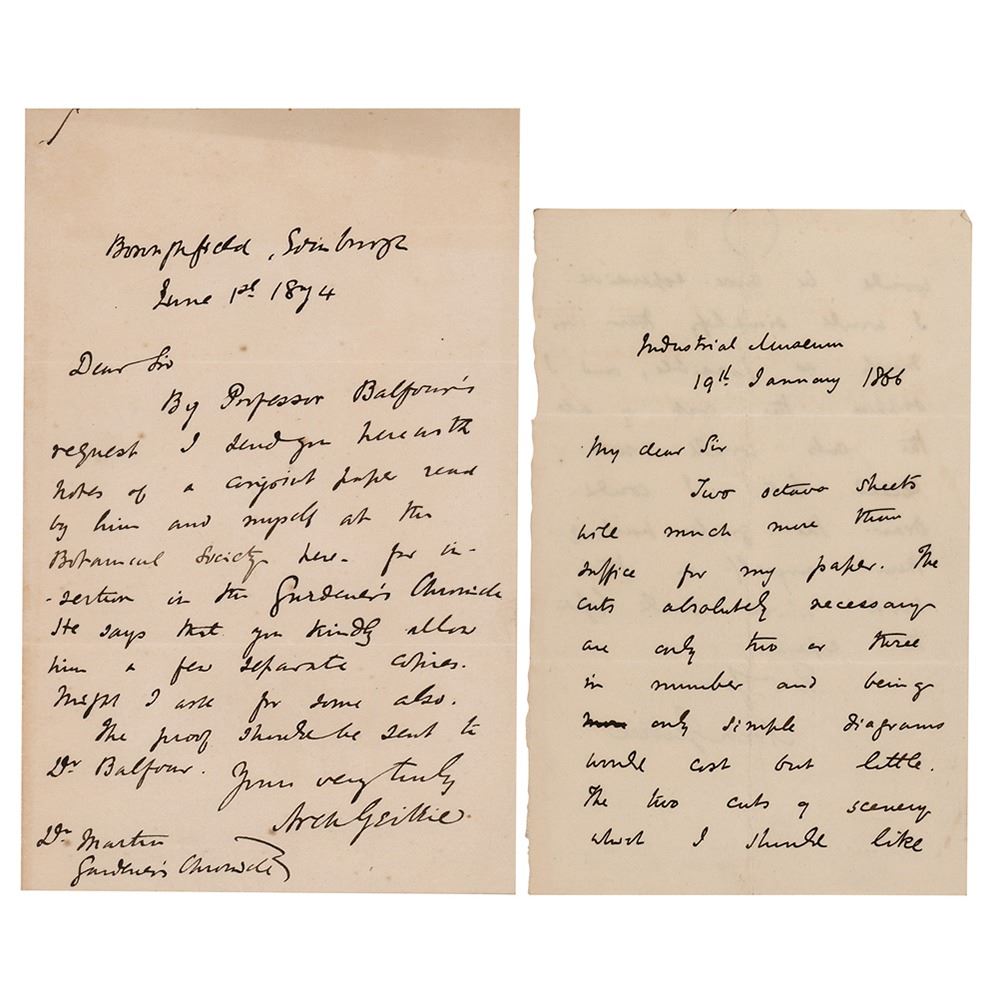 Eminent Scottish geologist and writer (1835–1924). Two ALSs signed "Arch. Geikie," totaling three pages on two sheets, January 19, 1866, and June 1, 1874. The first, in part: "Two octavo sheets will much more than suffice for my paper. The cuts absolutely necessary are only two or three in number and being only simple diagrams would cost but little." The second, in part: "By Professor Balfour's request I send you herewith notes of a conjoint paper sent by him and myself at the Botanical Society…for insertion in the Gardeners Chronicle. He says that you kindly allow him a few separate copies. Might I ask for some also. The proof should be sent to Dr. Balfour." In overall fine condition, with rusty circular paperclip impressions to the top.
