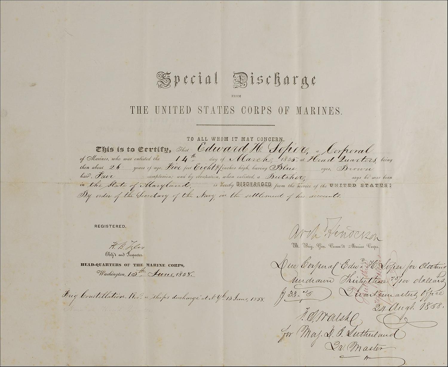 Fifth (and longest-serving) Commandant of the United States Marine Corps (1783–1859), who served from 1820 to 1859. Partly-printed DS, signed “Arch. Henderson,” one page, 17 x 14, June 13, 1858. Special discharge issued to Corporal Edward H. Soper, serving aboard the frigate Constellation, who was a butcher at the time of his enlistment. Signed at the conclusion by Henderson as Commandant of the Marine Corps. In very good condition, with small separations along fragile intersecting folds, with one fold through a single letter of signature, and scattered light toning and foxing. The first such Henderson discharge we have seen.