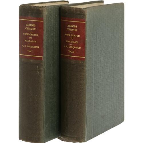 <B>Archibald R. Colquhoun:<I> Across Chryse, Being the Narrative of Exploration Through the South China Border Lands From Canton to Mandalay.</B></I></B></I> (London: Sampson Low, Marston, Searle, and Rivington, 1883), first edition, two volumes, 420 pages and 408 pages respectively, profusely illustrated, hand-colored maps, missing fold-out map bound in the back of volume one, old rebind in green cloth patterned boards with gilt titles (author's name misspelled on spine of both volumes), 8vo (6" x 9"), former owner's book plate on the ffep on each volume, uniform foxing to interior pages, especially the fold-out illustrations, preliminary pages wrinkled in volume one, spines darkened, a few spots on boards of volume one, general shelf wear, else very good condition.<BR><BR><b>Shipping:</b> Books & Catalogs (<a target="_blank" href="http://www.heritageauctions.com/common/shipping.php">view shipping information</a>)