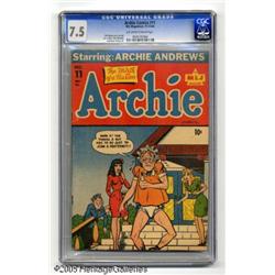 <B>Archie #11 (Archie, 1944) CGC VF- 7.5 Off-white to white pages.</B></I> Archie's smart enough to know that there's only one thing worse than being stared at by girls, and that's <I>not</B></I> being stared at by girls. The revoltin' development cover is by Bill Vigoda, who also drew most of the interior features. This is the highest-graded copy of this issue that CGC has certified to date. Overstreet 2004 VF 8.0 value = $388. CGC census 12/04: 1 in 7.5, none higher.