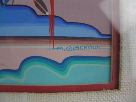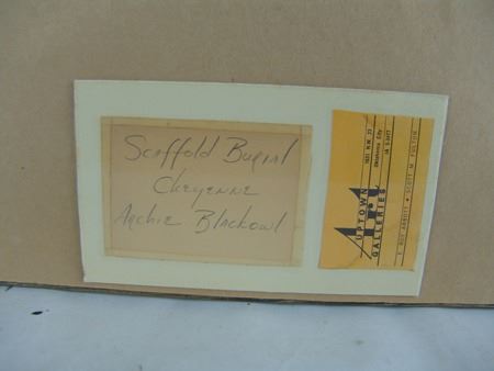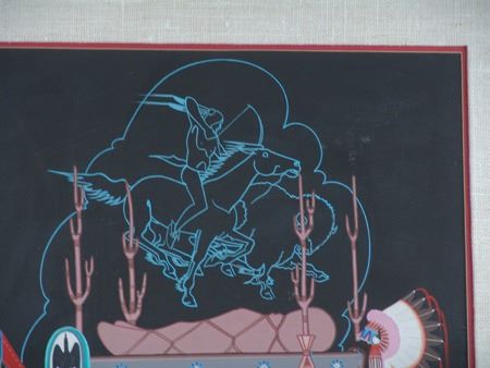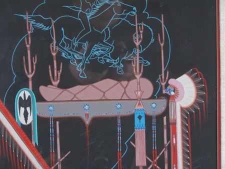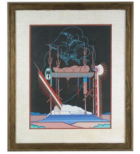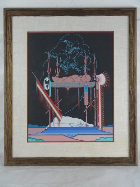 Ca. 1970, Beautiful signed original gouache on black paper titled "Cheyenne Burial Scaffold," with sprit rising above and the fallen warrior's horse lying below. Very good condition. Framed and matted under glass. 19" x 15" (28" x 24 " framed)
