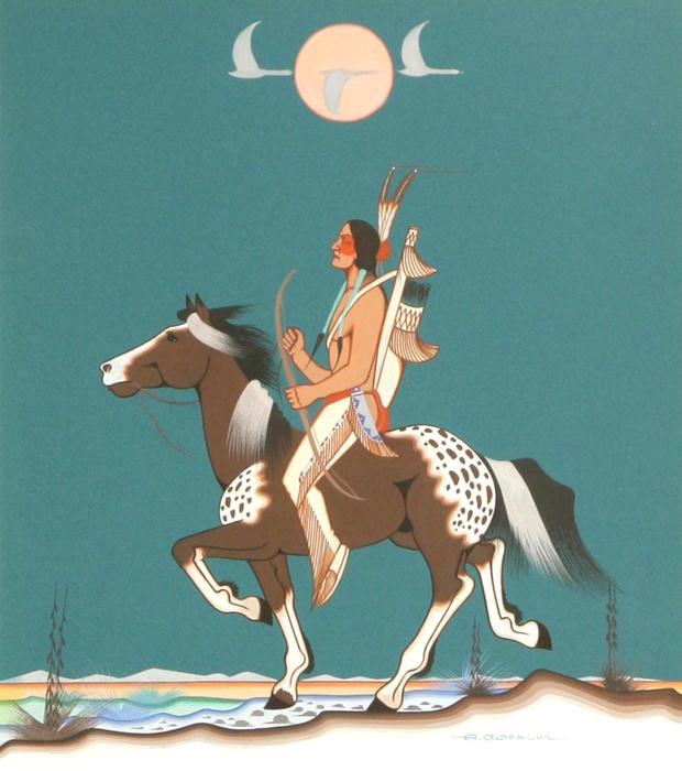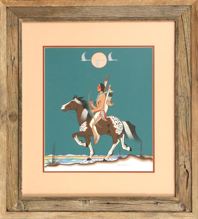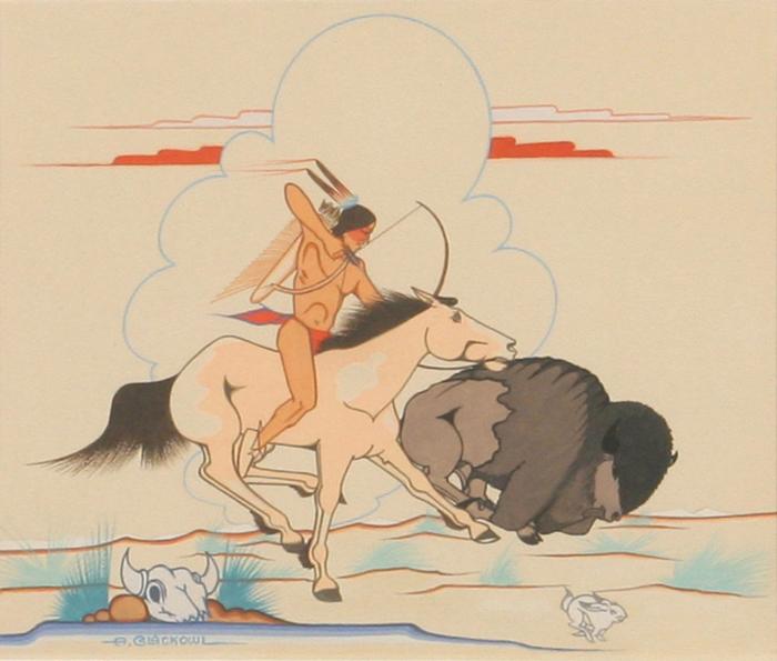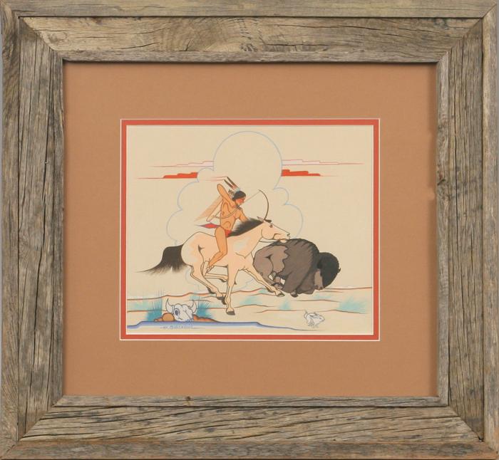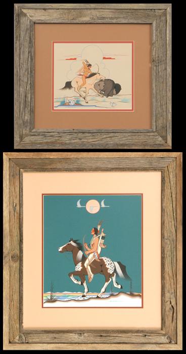 Archie Black Owl (1911-1967). Two Paintings. (1) Hunting Buffalo. 9" x 10 3/4" gouache. signed lower left. (2) Night Ride. 16" x 13 1/2" gouache. signed lower right. Condition Report: Both in fine condition.