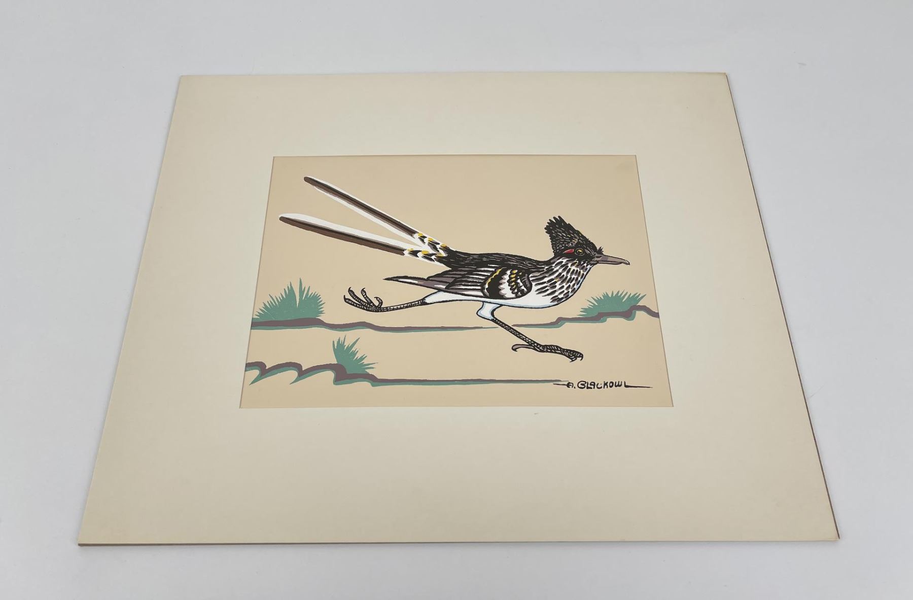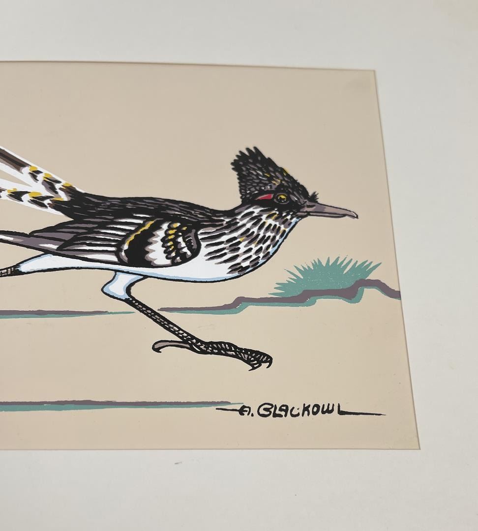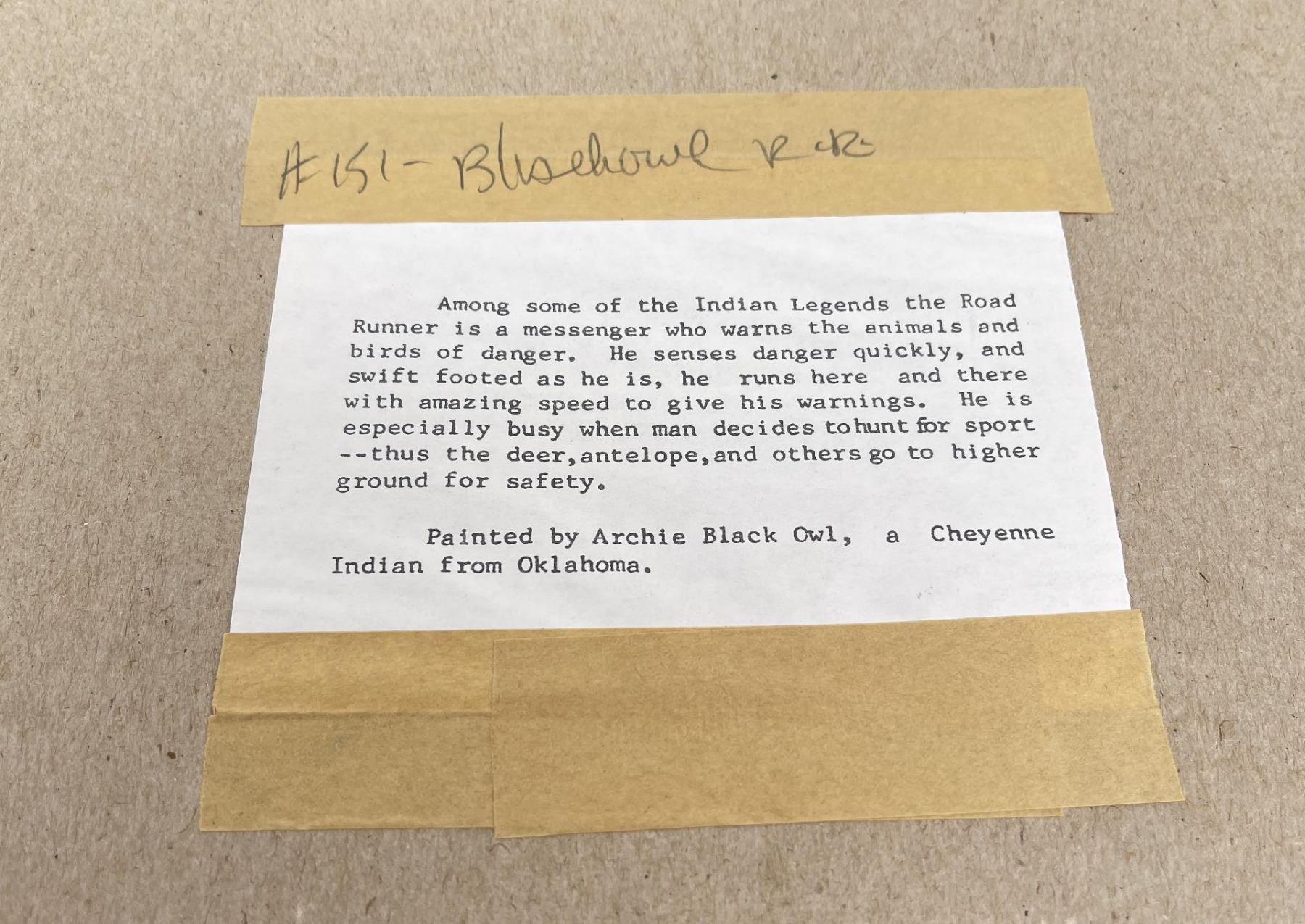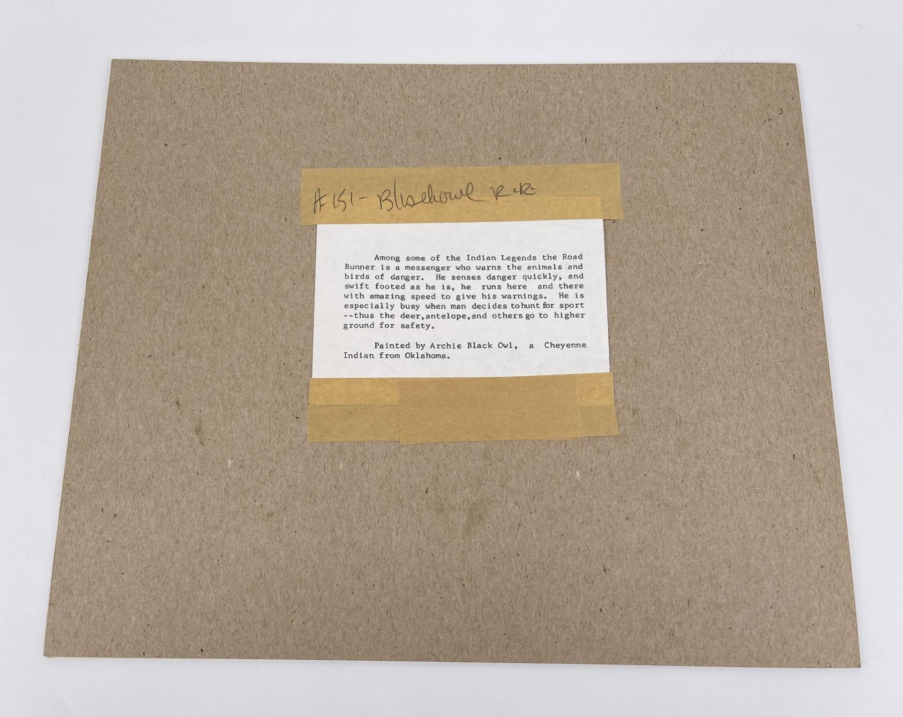 Nice Serigraph by Archie Black Owl. Roadrunner. 10" by 12" including matte. Archie Blackowl was born in Custer County, Oklahoma, on November 23, 1911. Indigenous artists, such as Blackowl, grew up being sensitive to nature. Archie's culture made him sensitive to natural textures, which created a traditional Indian school of painting (much like the Kiowa art movement from Oklahoma). This included flat shaded native images and was an encouraged style in art competitions (Oklahoma 1946). For the public, it encompassed a "real Indian art" which Archie helped to contribute to. Though some scholars say this is the only legitimate art, it proved to be a unique piece of a large mosaic of art.