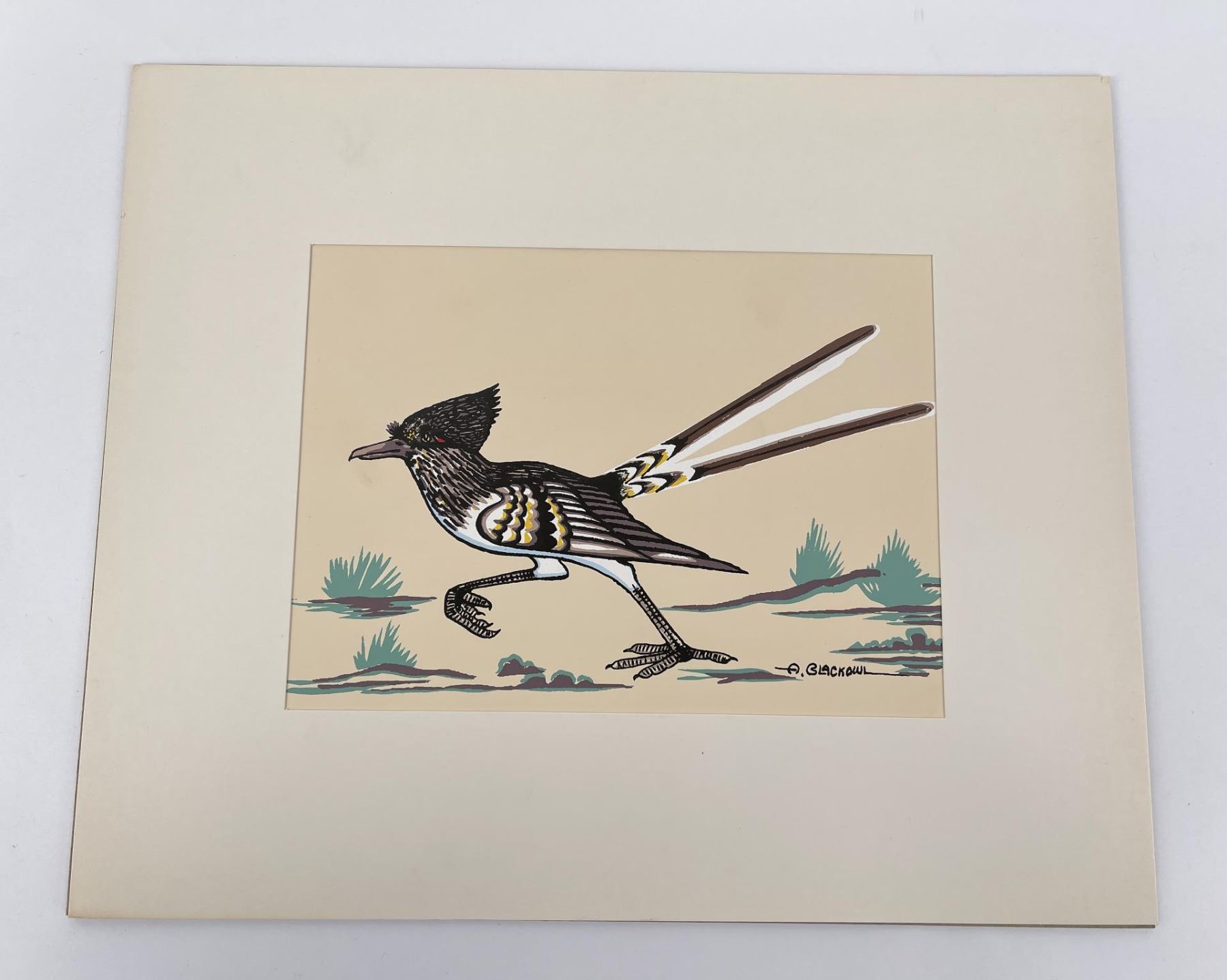 Nice Serigraph by Archie Black Owl. Roadrunner. 10" by 12" including matte. Archie Blackowl was born in Custer County, Oklahoma, on November 23, 1911. Indigenous artists, such as Blackowl, grew up being sensitive to nature. Archie's culture made him sensitive to natural textures, which created a traditional Indian school of painting (much like the Kiowa art movement from Oklahoma). This included flat shaded native images and was an encouraged style in art competitions (Oklahoma 1946). For the public, it encompassed a "real Indian art" which Archie helped to contribute to. Though some scholars say this is the only legitimate art, it proved to be a unique piece of a large mosaic of art.