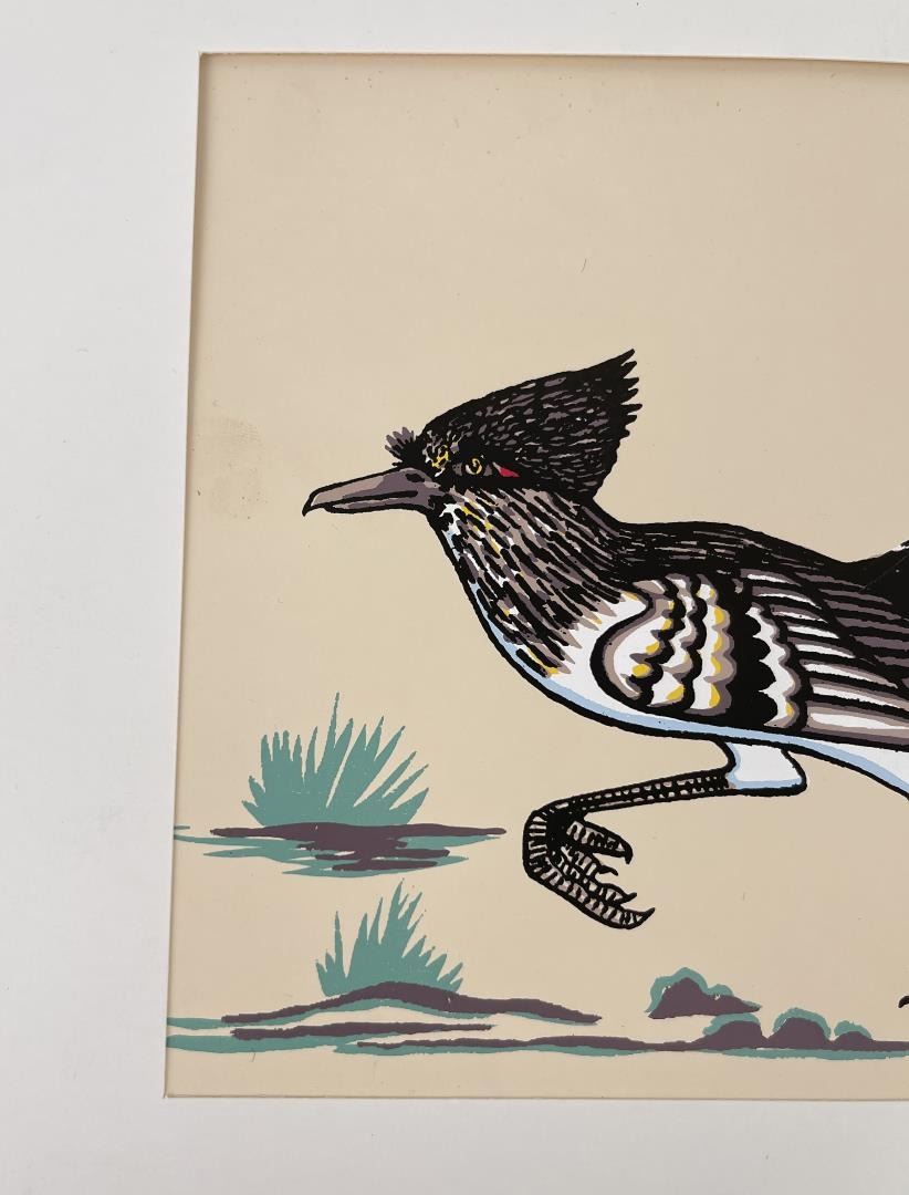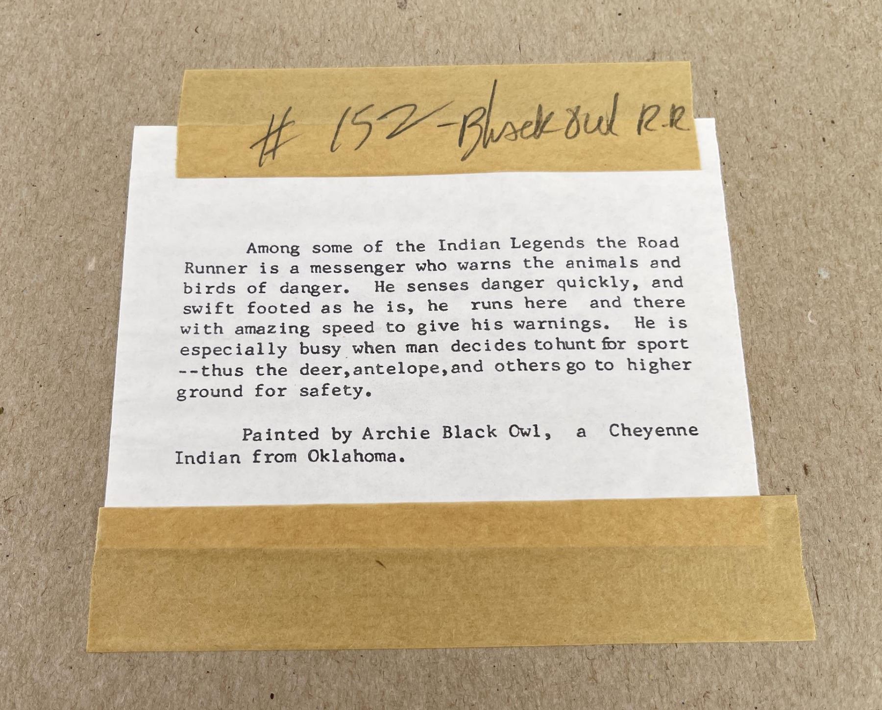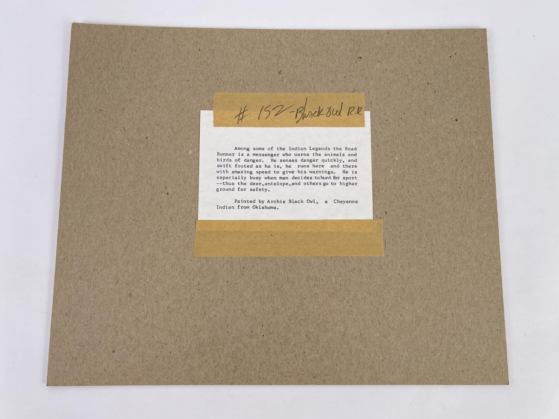 Nice Serigraph by Archie Black Owl. Roadrunner. 10" by 12" including matte. Archie Blackowl was born in Custer County, Oklahoma, on November 23, 1911. Indigenous artists, such as Blackowl, grew up being sensitive to nature. Archie's culture made him sensitive to natural textures, which created a traditional Indian school of painting (much like the Kiowa art movement from Oklahoma). This included flat shaded native images and was an encouraged style in art competitions (Oklahoma 1946). For the public, it encompassed a "real Indian art" which Archie helped to contribute to. Though some scholars say this is the only legitimate art, it proved to be a unique piece of a large mosaic of art.