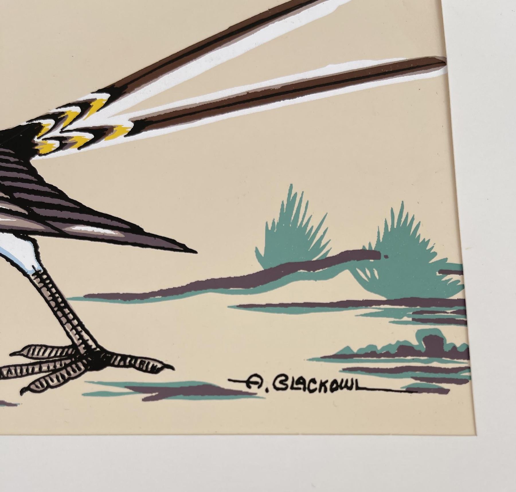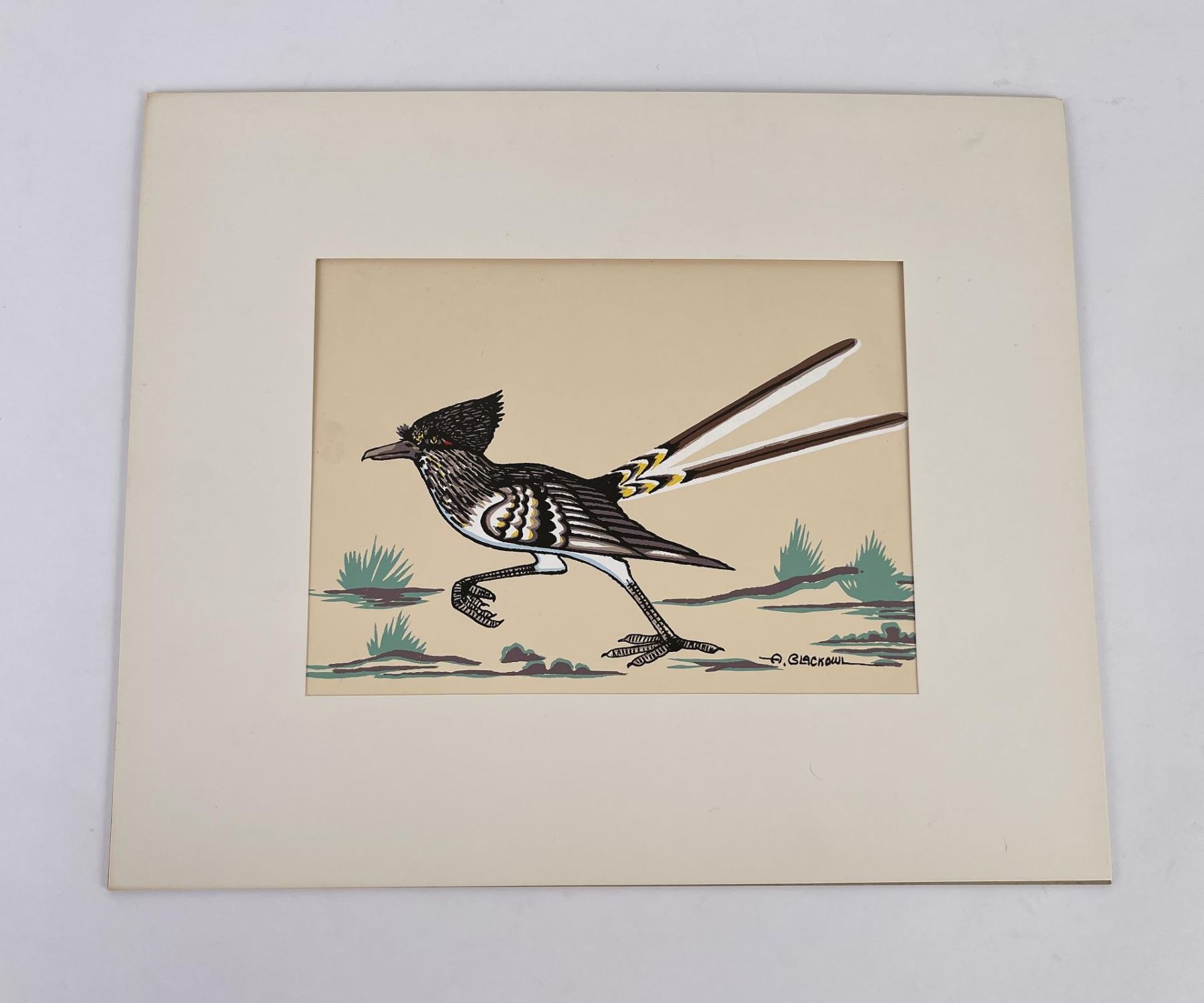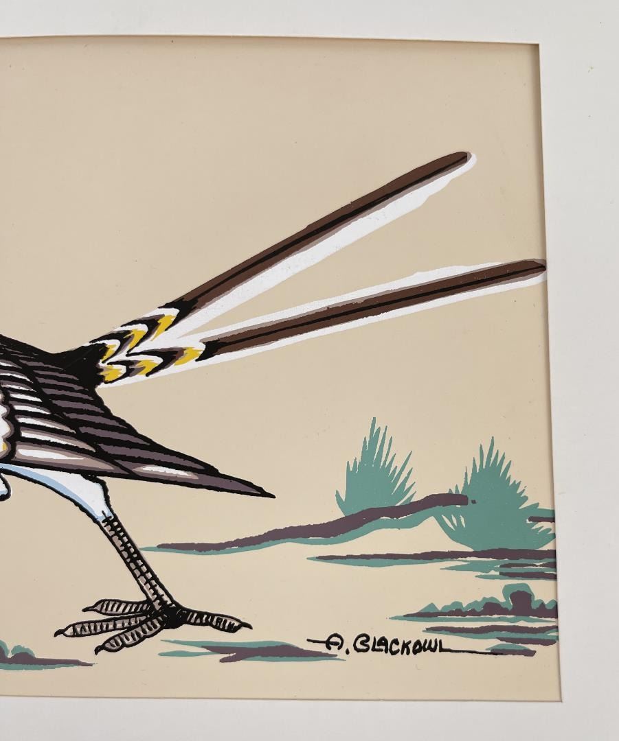 Nice Serigraph by Archie Black Owl. Roadrunner. 10" by 12" including matte. Archie Blackowl was born in Custer County, Oklahoma, on November 23, 1911. Indigenous artists, such as Blackowl, grew up being sensitive to nature. Archie's culture made him sensitive to natural textures, which created a traditional Indian school of painting (much like the Kiowa art movement from Oklahoma). This included flat shaded native images and was an encouraged style in art competitions (Oklahoma 1946). For the public, it encompassed a "real Indian art" which Archie helped to contribute to. Though some scholars say this is the only legitimate art, it proved to be a unique piece of a large mosaic of art.