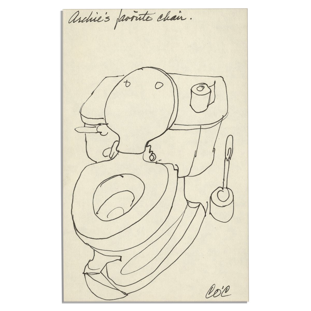 Carroll O'Connor hand drawing signed ''C O'C''. The actor who played Archie Bunker for over a decade on ''All in the Family'' and ''Archie Bunker's Place'' draws a toilet, complete with roll of paper resting on the tank. He labels the drawing, ''Archie's favorite chair''. On the show his favorite chair was an easy chair in the living room. Ink drawing measures 5'' x 8''. Near fine.
