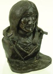 Signed, limited edition (# 30/60) bronze sculpture showing an Indian warrior with both a pipe and an axe, contemplating war or peace, and titled "The Decision". Very good condition. Ca. 1970. 7-1/2" x 5-1/2" x 6"