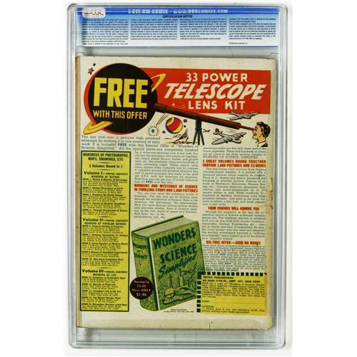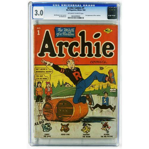 <B>Archie Comics #1 (MLJ, 1942) CGC GD/VG 3.0 Off-white to white pages.</B></I> It's rare for the owner of an <B>Archie</B></I> #1 to want to part with his or her copy, because it's a significant book in the Archie line. For one thing, it has the story of how Archie met Veronica, in which the folks at MLJ simply discarded the previous story told in <B>Pep Comics</B></I> #26 (in which the two just met on the street). This time, Archie reads about the lovely New York debutante-to-be in the paper, and he's so lovestruck that he writes to her and invites her to his prom in Riverdale! The issue is also notable for having the first appearance of Mrs. Andrews (Archie's mom), and of course because it's the first issue of a series that's still in publication today. The series is considered the first teen comic by Overstreet, and this issue is number 51 on the Guide's list of the 100 most valuable Golden Age books. We've seen even a Poor copy of this book sell for big bucks, and our offering here puts that one to shame. Considering that the highest-graded copy in CGC's census is just a 6.5, we'd say this copy will make some lucky Archie collector very happy. Overstreet 2005 GD 2.0 value = $1,294; VG 4.0 value = $2,588. CGC census 12/05: 2 in 3.0, 5 higher.