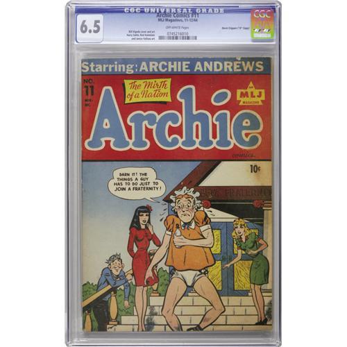 <B>Archie Comics #11 Davis Crippen ("D" Copy) pedigree (MLJ, 1944) CGC FN+ 6.5 Off-white pages.</B></I> Word is getting around that these are tough to find in grade! The highest-graded copy is just a 7.5. Bill Vigoda handled cover art chores. Overstreet 2006 FN 6.0 value = $201; VF 8.0 value = $419. CGC census 9/06: 1 in 6.5, 2 higher. <I>From the Crippen Collection.</B></I><BR><BR><b>Shipping:</b> Slabbed Comic (<a target="_blank" href="http://www.heritageauctions.com/common/shipping.php">view shipping information</a>)