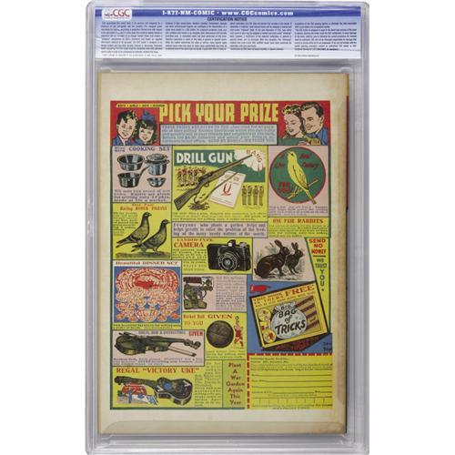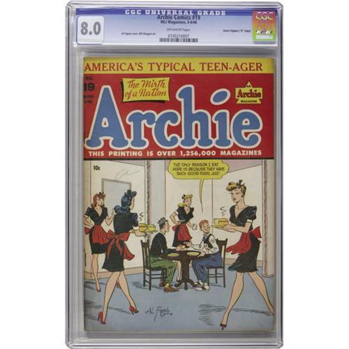 <B>Archie Comics #19 Davis Crippen ("D" Copy) pedigree (MLJ, 1946) CGC VF 8.0 Off-white pages.</B></I> Here's the only copy of this issue graded above FN 6.0 by CGC to date. This is the first of only three issues to have the interesting cover blurb "This printing is over 1,256,000 magazines" (a higher number was used on #20 and #21). And it shows how popular Archie had become less than five years after his first appearance. Al Fagaly handled the cover art here, while Bill Woggon of Katy Keene fame contributed to the interior. Overstreet 2006 VF 8.0 value = $419. CGC census 9/06: 1 in 8.0, none higher. <I>From the Crippen Collection.</B></I><BR><BR><b>Shipping:</b> Slabbed Comic (<a target="_blank" href="http://www.heritageauctions.com/common/shipping.php">view shipping information</a>)