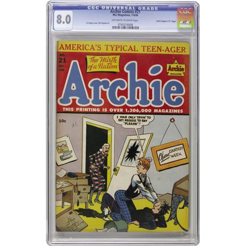 <B>Archie Comics #21 Davis Crippen ("D" Copy) pedigree (Archie, 1946) CGC VF 8.0 Off-white to white pages.</B></I> Oh boy, try and find another copy of this one! CGC hasn't as of this writing. A bonus is that the cover has Reggie getting a good old fashioned lickin', something that Archie fans have been waiting for! It's also one of the earlier cover appearances for Miss Grundy, drawn by Al Fagaly. Overstreet 2006 VF 8.0 value = $262. CGC census 9/06: 1 in 8.0, none higher. <I>From the Crippen Collection.</B></I><BR><BR><b>Shipping:</b> Slabbed Comic (<a target="_blank" href="http://www.heritageauctions.com/common/shipping.php">view shipping information</a>)