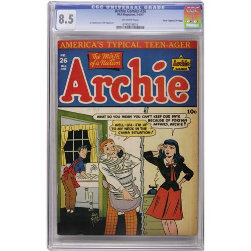 <B>Archie Comics #26 Davis Crippen ("D" Copy) pedigree (Archie, 1947) CGC VF+ 8.5 Off-white pages.</B></I> Here's yet another "D" copy <B>Archie</B></I> that's the sole entry in CGC's census to date. The topical humor only adds to the appeal of this Al Fagaly cover. Overstreet 2006 VF 8.0 value = $262; VF/NM 9.0 value = $406. CGC census 9/06: 1 in 8.5, none higher. <I>From the Crippen Collection.</B></I><BR><BR><b>Shipping:</b> Slabbed Comic (<a target="_blank" href="http://www.heritageauctions.com/common/shipping.php">view shipping information</a>)