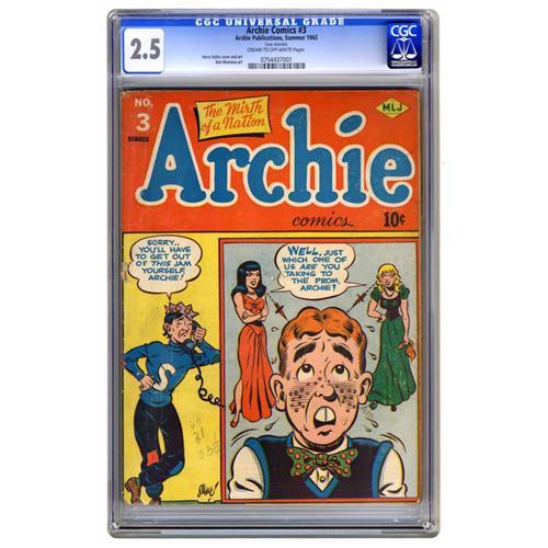 <B>Archie Comics #3 (Archie, 1943) CGC GD+ 2.5 Cream to off-white pages.</B></I> We believe this to be the first love-triangle cover for the Archie characters! After 60-plus years of publication, we figure that Archie has probably attended about his 1,000th comic-book prom by now, and the dilemma of whom to ask, Betty or Veronica, is still as tough as it was here in 1943. This issue is rated "scarce" by both Overstreet and Gerber. The cover and interior art are by Harry Sahle, and there's also a contribution by Archie's co-creator, Bob Montana. CGC notes, "Cover detached." Overstreet 2006 GD 2.0 value = $267. CGC census 4/06: 1 in 2.5, 4 higher.