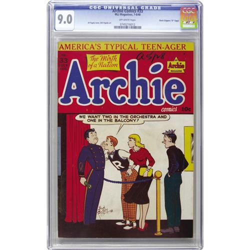 <B>Archie Comics #33 Davis Crippen ("D" Copy) pedigree (Archie, 1948) CGC VF/NM 9.0 Off-white pages.</B></I> This isn't a book you'd expect to see in this grade! The cover is by Al Fagaly. Overstreet 2006 VF/NM 9.0 value = $257; NM- 9.2 value = $340. CGC census 9/06: 2 in 9.0, none higher. <I>From the Crippen Collection.</B></I><BR><BR><b>Shipping:</b> Slabbed Comic (<a target="_blank" href="http://www.heritageauctions.com/common/shipping.php">view shipping information</a>)