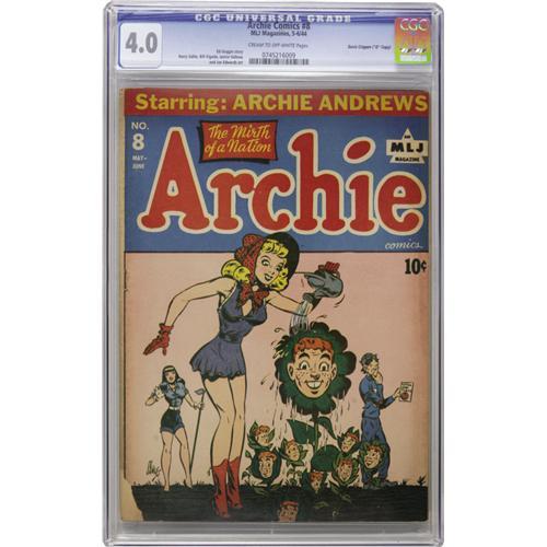 <B>Archie Comics #8 Davis Crippen ("D" Copy) pedigree (Archie, 1944) CGC VG 4.0 Cream to off-white pages.</B></I> Here's the only unrestored copy of this issue that has been certified as of this writing! If you haven't been following the results of the "D" Copy <B>Archie</B></I>s in our previous auctions, let us give you a word to the wise: budget a large amount. This issue's cover is by Harry Sahle. Overstreet 2006 VG 4.0 value = $208. CGC census 9/06: 1 in 4.0, none higher. <I>From the Crippen Collection.</B></I><BR><BR><b>Shipping:</b> Slabbed Comic (<a target="_blank" href="http://www.heritageauctions.com/common/shipping.php">view shipping information</a>)