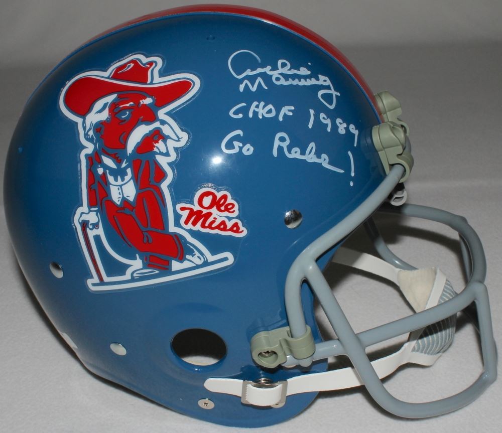 Full-size throwback suspension helmet. Hand-signed and inscribed in white paint pen by Archie Manning (Saints). Limited Edition #10/18. Please note, you are bidding on the edition number in the title. The images shown are stock images from the same edition run. The autograph includes an official Radtke Sports hologram and matching COA for authenticity purposes. Also includes proof picture from the signing.