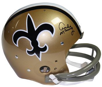 Saints' legendary Quarterback Archie Manning has personally hand-signed this New Orleans Saints Riddell TK Full Size 2-bar TB Helmet, one of the greatest quarterbacks in New Orleans Saints history, played ten seasons with the team during the days of the loveable losers. At a time when the team was jokingly referred to as the "Aints," Manning was one of the few bright spots. Only once in his career did the Saints finish .500, which was the only season they finished higher than third in their division. However, because Manning played in a time before free agency, he was good enough to keep his team from the top talent in the NFL Draft, but could not take his team to the next level with the supporting cast. Despite his team, he managed to make it to the Pro Bowl in 1978 and 1979. Manning finished his career with the Minnesota Vikings after two seasons with the Houston Oilers. Since 1982, when Archie left the organization, no New Orleans Saint has worn the number eight, and it is commonly understood that no future player will, although his number has not officially been retired. This Archie Manning Autograph is guaranteed authentic and includes a Steiner Sports Certificate of Authenticity and an accompanying tamper-evident Steiner Hologram.