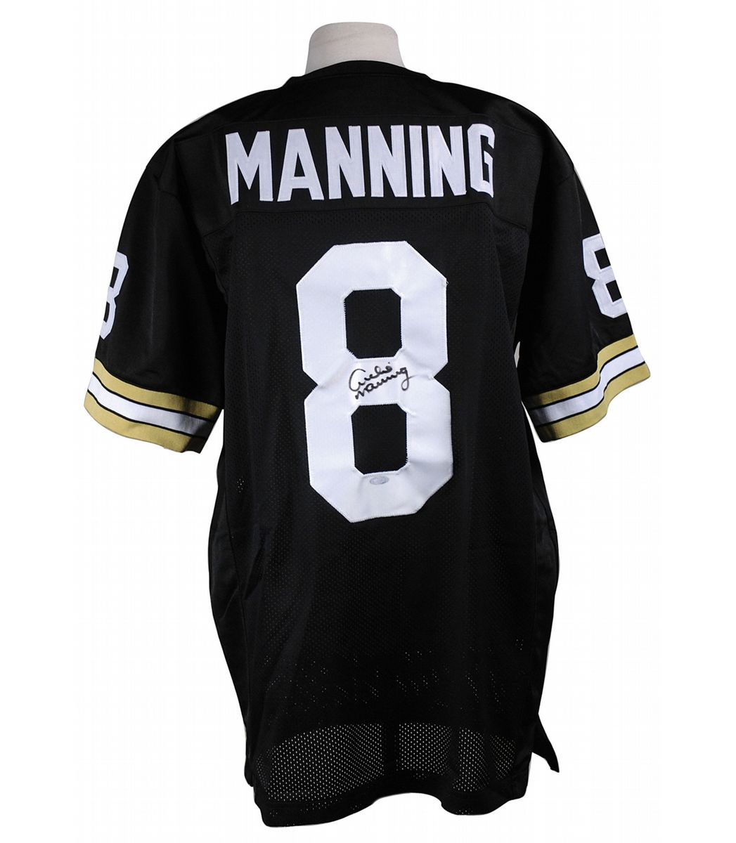 Replica New Orleans Saints football jersey, with sewn on letters and numbers, signed in black felt tip on the number on the back. In fine condition, with a Steiner label affixed to the number. Accompanied by a certificate of authenticity from Steiner Sports.
