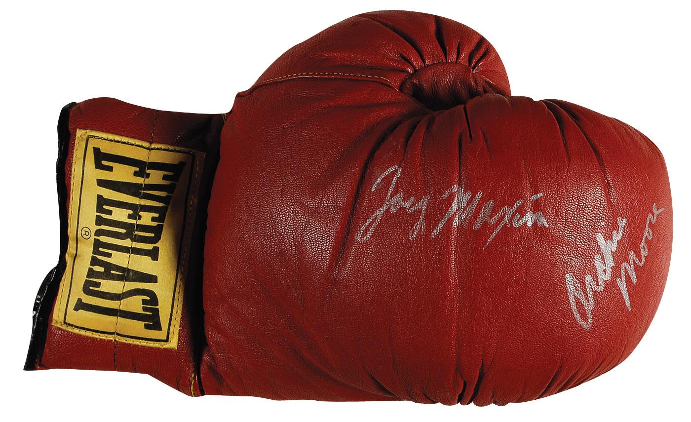 Everlast right-handed boxing glove signed in silver ink on the top by both Archie Moore and Joey Maxim. In fine condition.