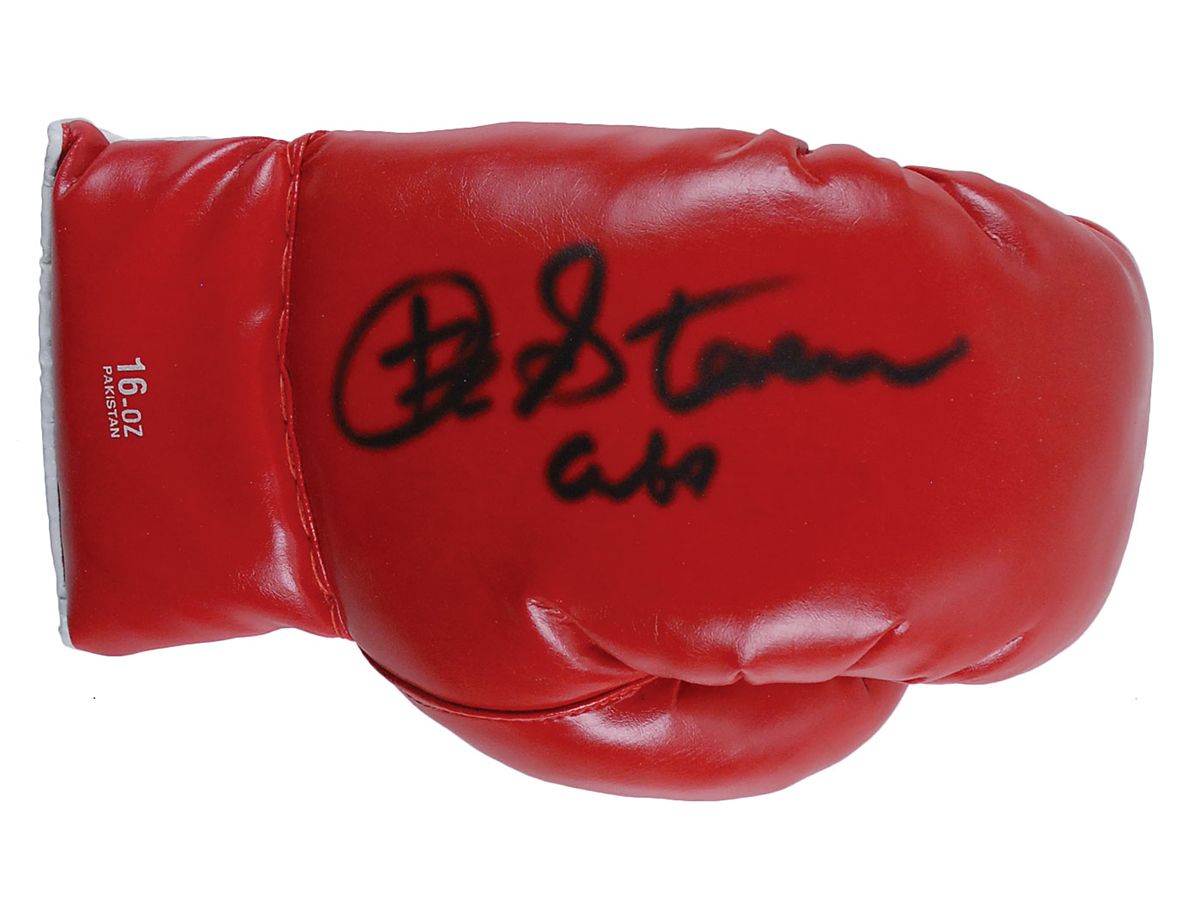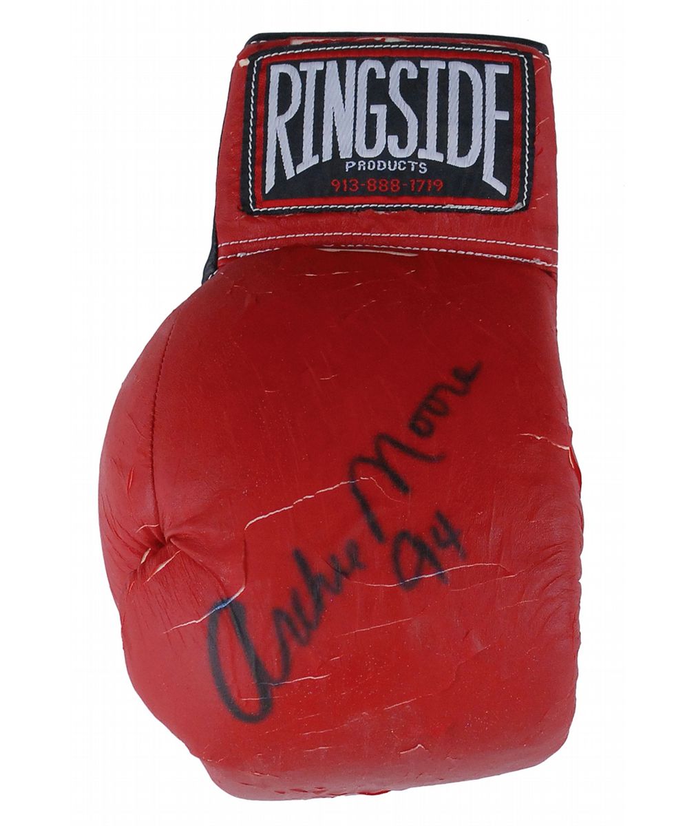 Two gloves: lightweight left-handed Ringside boxing glove, signed on the top in black felt tip, “Archie Moore 94”; and a 16-oz left-handed boxing glove, signed on the top in black felt tip by Stevenson. In very good condition, with light spreading to both signatures, resulting in slightly fuzzy appearances, and some cracks and crazing to Moore’s glove, a few passing through signature.