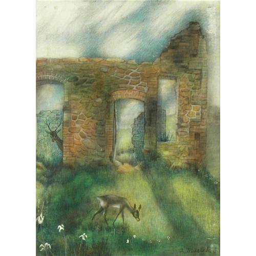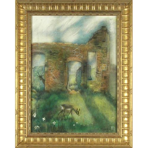 Archie Musick (1902-1978) Broadmoor Art Academy, Tempera on Board, Deer in Ruins, 16" x 12", signed lower right