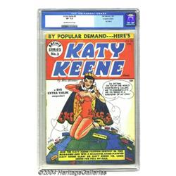 Archie Series #3 Canadian Edition (Bell Features, 1950) CGC VF- 7.5 Cream to off-white pages. This seldom-seen Canadian edition is identical in cover and content to the American Katy Keene #1. Bill Woggon's cover takes a few liberties with geography, but his drawing of Katy is so cute that we won't hold that against him. The interior art is also by Woggon. Though this Canadian variant is not listed in Overstreet's Comic Book Price Guide, the aforementioned American comic in VF 8.0 has a 2003 Guide value of $625. Important notice: Heritage usually auctions material at the rate of 200-250 lots per hour. On some occasions eBay Live bid software or the Internet may not be able to keep up with the pace of the auction. We recommend placing a realistic absentee bid now as insurance to avoid disappointment. Occasionally the auctioneer may eliminate or reject an eBay Live bid, and the auctioneer may also reopen a lot after the close of the eBay live bidding (usually because we missed an audience bid), and may reject your bid even if it shows you as the winning bidder. By bidding via eBay Live, you agree that Heritage may award the lot to another bidder at its sole discretion under the circumstances described above or any other reasonable circumstances. Since eBay bids are not shown to us until we open the lot on the floor, we treat those bids just like floor bids. In most cases the floor responds before the eBay bid is presented to us, due to Internet lag time, so for consistency we have made it a policy that floor bids are always considered first over tie eBay live bids. Also please note that all Heritage lots purchased through eBay Live carry a 20% Buyer's Premium. Please make sure you read the Terms and Conditions before you bid.