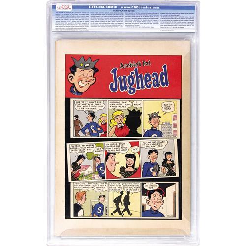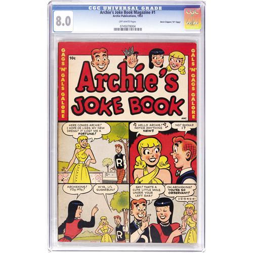 <B>Archie's Joke Book Magazine #1 Davis Crippen ("D" Copy) pedigree (Archie, 1953) CGC VF 8.0 Off-white pages.</B></I> Also known as the 1953 one-shot, this was followed by a second issue in short order, and the series became an Archie mainstay, running for almost 40 years! We hadn't ever seen the first issue before, and for anyone who collects the Riverdale gang, seeing this is as big a thrill as some of the great superhero mags, horror comics etc. in this amazing collection. Overstreet 2006 VF 8.0 value = $600. CGC census 6/06: 2 in 8.0, none higher. <I>From the Crippen Collection.</B></I> <BR><BR><B>Important notice:</B> Heritage usually auctions material at the rate of 200-250 lots per hour. On some occasions eBay Live bid software or the Internet may not be able to keep up with the pace of the auction. We recommend placing a realistic absentee bid now as insurance to avoid disappointment. Occasionally the auctioneer may eliminate or reject an eBay Live bid, and the auctioneer may also reopen a lot after the close of the eBay live bidding (usually because we missed an audience bid), and may reject your bid even if it shows you as the winning bidder. By bidding via eBay Live, you agree that Heritage may award the lot to another bidder at its sole discretion under the circumstances described above or any other reasonable circumstances. Since eBay bids are not shown to us until we open the lot on the floor, we treat those bids just like floor bids. In most cases the floor responds before the eBay bid is presented to us, due to Internet lag time, so for consistency we have made it a policy that floor bids are always considered first over tie eBay live bids. Also please note that all Heritage lots purchased through eBay Live carry a 22.5% Buyer's Premium. Please make sure you read the Terms and Conditions before you bid. This lot is being auctioned in conjunction with a live floor auction by Heritage Auction Galleries. All final auction and invoice information will be supplied by Heritage Auction Galleries, and all other information should be considered preliminary. Lot:41001 <BR><BR><B>Winning Notification and Billing:</B> After the FINAL session in this auction is complete, Heritage will send e-mail and snail mail invoices. This process normally takes several days. All final auction and invoice information will be supplied by Heritage Auction Galleries, and all other information should be considered preliminary. <BR><BR>This auction will be conducted on a live auction floor and over the Internet through eBay Live. If you choose to place an absentee bid, please take a moment to <font color='#0000ff'><u><a href='http://pages.ebay.com/liveauctions/help/before/laabsentee.html'>learn how eBay Live absentee bidding works</a></u></font><font color='#000000'>