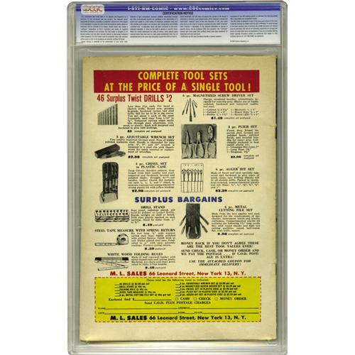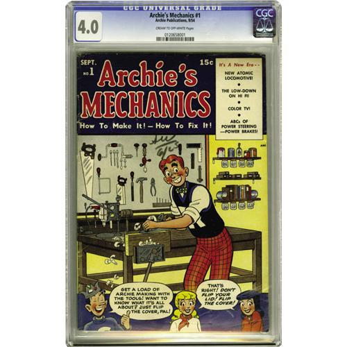 <B>Archie's Mechanics #1 (Archie, 1954) CGC VG 4.0 Cream to off-white pages.</B></I> Gerber has assigned this difficult-to-locate issue a scarcity rating of "6". Overstreet 2006 VG 4.0 value = $160. CGC census 5/06: 1 in 4.0, 1 higher. <BR><BR><B>Important notice:</B> Heritage usually auctions material at the rate of 200-250 lots per hour. On some occasions eBay Live bid software or the Internet may not be able to keep up with the pace of the auction. We recommend placing a realistic absentee bid now as insurance to avoid disappointment. Occasionally the auctioneer may eliminate or reject an eBay Live bid, and the auctioneer may also reopen a lot after the close of the eBay live bidding (usually because we missed an audience bid), and may reject your bid even if it shows you as the winning bidder. By bidding via eBay Live, you agree that Heritage may award the lot to another bidder at its sole discretion under the circumstances described above or any other reasonable circumstances. Since eBay bids are not shown to us until we open the lot on the floor, we treat those bids just like floor bids. In most cases the floor responds before the eBay bid is presented to us, due to Internet lag time, so for consistency we have made it a policy that floor bids are always considered first over tie eBay live bids. Also please note that all Heritage lots purchased through eBay Live carry a 22.5% Buyer's Premium. Please make sure you read the Terms and Conditions before you bid. This lot is being auctioned in conjunction with a live floor auction by Heritage Auction Galleries. All final auction and invoice information will be supplied by Heritage Auction Galleries, and all other information should be considered preliminary. Lot:41001 <BR><BR><B>Winning Notification and Billing:</B> After the FINAL session in this auction is complete, Heritage will send e-mail and snail mail invoices. This process normally takes several days. All final auction and invoice information will be supplied by Heritage Auction Galleries, and all other information should be considered preliminary. <BR><BR>This auction will be conducted on a live auction floor and over the Internet through eBay Live. If you choose to place an absentee bid, please take a moment to <font color='#0000ff'><u><a href='http://pages.ebay.com/liveauctions/help/before/laabsentee.html'>learn how eBay Live absentee bidding works</a></u></font><font color='#000000'>