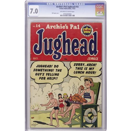 <B>Archie's Pal Jughead #14 (Archie, 1952) CGC FN/VF 7.0 Off-white to white pages.</B></I> Bill Vigoda cover. Overstreet 2006 FN 6.0 value = $60; VF 8.0 value = $112. CGC census 9/06: 1 in 7.0, 1 higher.<BR><BR><b>Shipping:</b> Slabbed Comic (<a target="_blank" href="http://www.heritageauctions.com/common/shipping.php">view shipping information</a>)