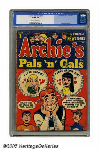 <B>Archie's Pals 'n' Gals #1 (Archie, 1952) CGC VG/FN 5.0 Cream to off-white pages.</B></I> Reggie and Jughead were Archie's pals, Betty and Veronica were Archie's gals, and this series was a mainstay of the Archie line, remaining in publication for nearly 40 years. A square bound giant issue started things off. The issue's artists include Dave Berg; the cover's by Bill Vigoda. Note that the CGC slab has a four-inch crack at the top rear. Overstreet 2005 VG 4.0 value = $154; FN 6.0 value = $231. CGC census 7/05: 1 in 5.0, 3 higher.