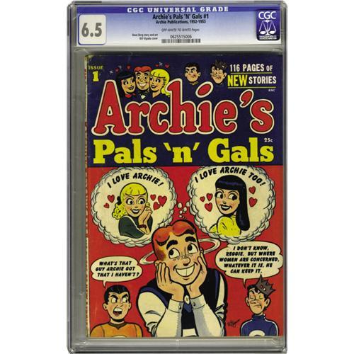 <B>Archie's Pals 'n' Gals #1 (Archie, 1953) CGC FN+ 6.5 Off-white to white pages.</B></I> This series was seemingly around forever (pretty close: 1952-1991), and it's a neat treat to see the first issue, which is a square bound giant. Everyone knows that Reggie and Jughead were the pals and Betty and Veronica the gals, but did you know that Dave Berg of <B>Mad</B></I> fame contributed art to this first issue? The cover's by Archie veteran Bill Vigoda. Overstreet 2006 FN 6.0 value = $240; VF 8.0 value = $500. CGC census 5/06: 1 in 6.5, 2 higher. <BR><BR><B>Important notice:</B> Heritage usually auctions material at the rate of 200-250 lots per hour. On some occasions eBay Live bid software or the Internet may not be able to keep up with the pace of the auction. We recommend placing a realistic absentee bid now as insurance to avoid disappointment. Occasionally the auctioneer may eliminate or reject an eBay Live bid, and the auctioneer may also reopen a lot after the close of the eBay live bidding (usually because we missed an audience bid), and may reject your bid even if it shows you as the winning bidder. By bidding via eBay Live, you agree that Heritage may award the lot to another bidder at its sole discretion under the circumstances described above or any other reasonable circumstances. Since eBay bids are not shown to us until we open the lot on the floor, we treat those bids just like floor bids. In most cases the floor responds before the eBay bid is presented to us, due to Internet lag time, so for consistency we have made it a policy that floor bids are always considered first over tie eBay live bids. Also please note that all Heritage lots purchased through eBay Live carry a 22.5% Buyer's Premium. Please make sure you read the Terms and Conditions before you bid. This lot is being auctioned in conjunction with a live floor auction by Heritage Auction Galleries. All final auction and invoice information will be supplied by Heritage Auction Galleries, and all other information should be considered preliminary. Lot:41001 <BR><BR><B>Winning Notification and Billing:</B> After the FINAL session in this auction is complete, Heritage will send e-mail and snail mail invoices. This process normally takes several days. All final auction and invoice information will be supplied by Heritage Auction Galleries, and all other information should be considered preliminary. <BR><BR>This auction will be conducted on a live auction floor and over the Internet through eBay Live. If you choose to place an absentee bid, please take a moment to <font color='#0000ff'><u><a href='http://pages.ebay.com/liveauctions/help/before/laabsentee.html'>learn how eBay Live absentee bidding works</a></u></font><font color='#000000'>