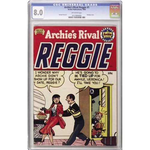 <B>Archie's Rival Reggie #1 (Archie, 1950) CGC VF 8.0 Off-white pages.</B></I> The closest thing Archie had to an archvillain in the early years was Reggie Mantle, and this first issue of the rogue's own title is tough to find in high grade (the only one graded higher to date is an 8.5). Overstreet 2006 VF 8.0 value = $506. CGC census 10/06: 2 in 8.0, 1 higher.<BR><BR><b>Shipping:</b> Slabbed Comic (<a target="_blank" href="http://www.heritageauctions.com/common/shipping.php">view shipping information</a>)