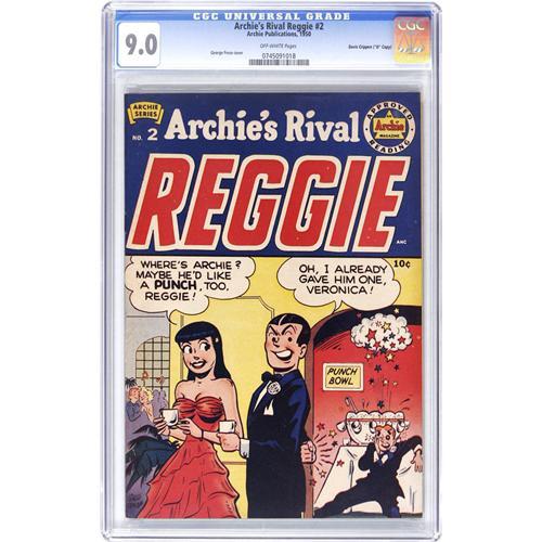 <B>Archie's Rival Reggie #2 Davis Crippen ("D" Copy) pedigree (Archie, 1950) CGC VF/NM 9.0 Off-white pages.</B></I> What's the first comic series to star a <I>jerk</B></I>? We think it's probably this vehicle for Archie's adversary Reggie Mantle. But after all, just as a superhero's only as good as his superfoes, Archie needs the despicability of Reggie to counterbalance his good-guy antics. This irregularly published title certainly had longevity, enduring until 1980 as <B>Reggie and Me</B></I>. Since many copies were no doubt used as dartboards by infuriated Archie fans over the years, it's no wonder that as of this writing, this is the only copy graded above VG+ by CGC. And why's this absolutely beautiful book only a 9.0 anyway? Who graded it... Reggie? Just kidding, CGC. Unlike Archie, this copy has no rival! Overstreet 2006 VF/NM 9.0 value = $361; NM- 9.2 value = $485. CGC census 7/06: 1 in 9.0, none higher. <I>From the Crippen Collection.</B></I> <BR><BR><B>Important notice:</B> Heritage usually auctions material at the rate of 200-250 lots per hour. On some occasions eBay Live bid software or the Internet may not be able to keep up with the pace of the auction. We recommend placing a realistic absentee bid now as insurance to avoid disappointment. Occasionally the auctioneer may eliminate or reject an eBay Live bid, and the auctioneer may also reopen a lot after the close of the eBay live bidding (usually because we missed an audience bid), and may reject your bid even if it shows you as the winning bidder. By bidding via eBay Live, you agree that Heritage may award the lot to another bidder at its sole discretion under the circumstances described above or any other reasonable circumstances. Since eBay bids are not shown to us until we open the lot on the floor, we treat those bids just like floor bids. In most cases the floor responds before the eBay bid is presented to us, due to Internet lag time, so for consistency we have made it a policy that floor bids are always considered first over tie eBay live bids. Also please note that all Heritage lots purchased through eBay Live carry a 22.5% Buyer's Premium. Please make sure you read the Terms and Conditions before you bid. This lot is being auctioned in conjunction with a live floor auction by Heritage Auction Galleries. All final auction and invoice information will be supplied by Heritage Auction Galleries, and all other information should be considered preliminary. Lot:41001 <BR><BR><B>Winning Notification and Billing:</B> After the FINAL session in this auction is complete, Heritage will send e-mail and snail mail invoices. This process normally takes several days. All final auction and invoice information will be supplied by Heritage Auction Galleries, and all other information should be considered preliminary. <BR><BR>This auction will be conducted on a live auction floor and over the Internet through eBay Live. If you choose to place an absentee bid, please take a moment to <font color='#0000ff'><u><a href='http://pages.ebay.com/liveauctions/help/before/laabsentee.html'>learn how eBay Live absentee bidding works</a></u></font><font color='#000000'>
