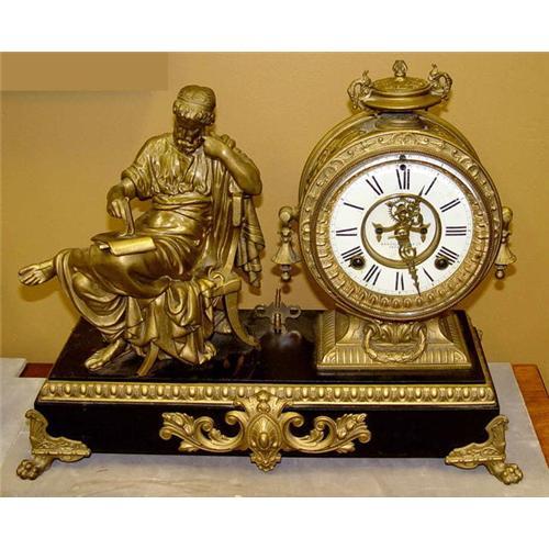 <table width="100%" border="0" cellspacing="0" cellpadding="4"><tr><td><em> </em></td></tr><tr> <td width="100%"> Archimedes Figural Ansonia Mantle Clock in a high relied gilt bronze finish on an ebonized base raised on 4 lion claw feet, charms on the half and on the hour, includes original s/f clock and chime key and would make a great gift or addition to any fine collection. ****NOTE: Email for larger images. </td></tr><tr> <td> </td></tr><tr> <td>Reference #: CL_112</td></tr><tr><td>Condition:Good working condition (see images).</td></tr><tr><td>Year:1882</td></tr><tr><td>Height:13.5 inches</td></tr><tr><td>Depth:7.5 inches</td></tr><tr><td>Width:17.5 inches </td></tr><tr><td>Title:Archimedes Ansonia Mantle Clock 1882 19c</td></tr><tr><td>Location:Long Island, NY</td></tr></table>