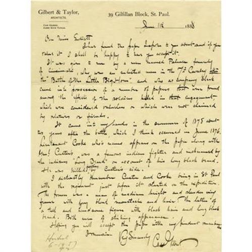 <B>Architect Cass Gilbert Autograph Letter With George Custer Content Signed</B></I> “<I>Cass Gilbert</B></I>”. One page, 8.5” x 11”, on Gilbert & Taylor letterhead, St. Paul, Minnesota, June 11, 1888, to a Miss Endicott. A fascinating letter in which Cass Gilbert, the architect who designed Woolworth Building and the Supreme Court Building, presents Endicott with a document signed by Custer and Lt. William Cooke of the 7th Cavalry. Gilbert details how he acquired the signed document: “<I>It was given to me by a man named Palmer…who was an enlisted man in the 7th Cavalry after the 'Battle of the Little Big Horn', and who as company clerk came into possession of a number of papers that were found among the effects of the soldiers killed in that engagement, which were considered valueless or which were not claimed by relatives or friends...it came into my hands in the summer of 1878 about two years after the battle…Lieutenant Cooke who's sic name appears on the paper along with Genl Custer's was a famous Indian fighter and nicknamed by the Indians 'Long Beard'…he was killed fighting by Custer's side…</B></I>”. Gilbert also includes a personal memory of Custer in the letter: “<I>I distinctly remember Custer and Cooke bring in St. Paul with the regiment just before it started on the expedition. The former was a man of medium height and slender wiry frame with long blond mustache and hair. The latter of a tall handsome figure with black hair and long black beard. Both were of striking appearance.</B></I>” Fine condition. <I>From the collection of Henry E. Luhrs.</B></I><BR><BR><b>Shipping:</b> Flat Material, Small (<a target="_blank" href="http://www.heritageauctions.com/common/shipping.php">view shipping information</a>)