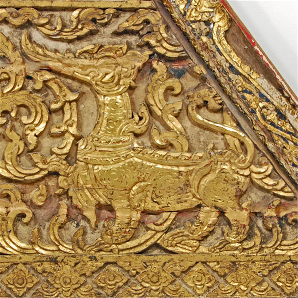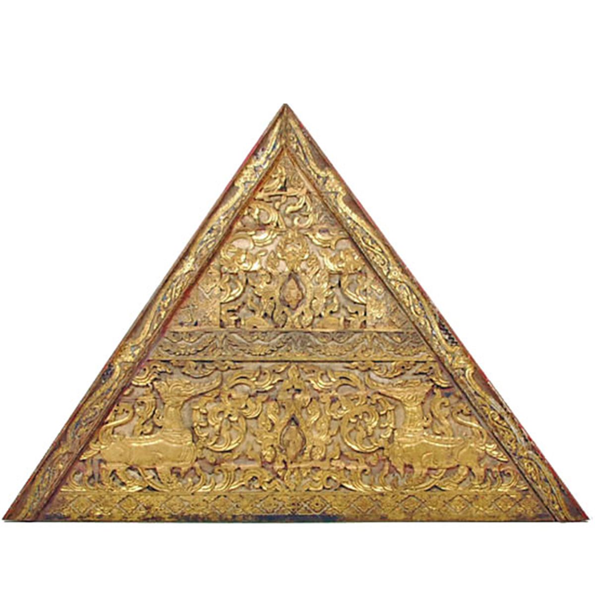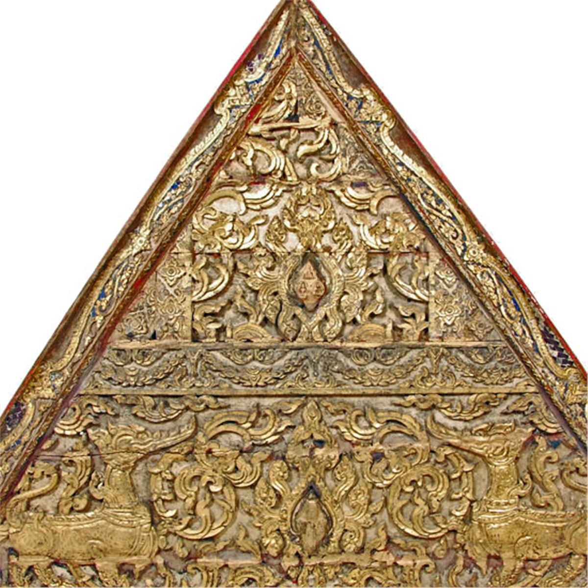 Early 1900s original Antique Teak Thai Buddhist Temple roof gable end. The piece measures 64" x 45" x 4".Rare piece from renovation of Wat (Temple) Nong Tum in Northern Thailand. Gilded and ornately designed with seated Buddha on elephants center. These t
