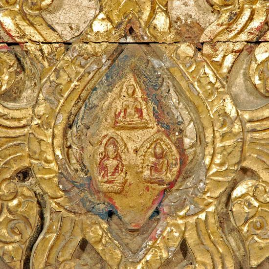 Early 1900s original Antique Teak Thai Buddhist Temple roof gable end. The piece measures 64" x 45" x 4".Rare piece from renovation of Wat (Temple) Nong Tum in Northern Thailand. Gilded and ornately designed with seated Buddha on elephants center. These teak pieces rarely come up any longer. Most newer temples are built of concrete. Rare Antiquity Investment opportunity!