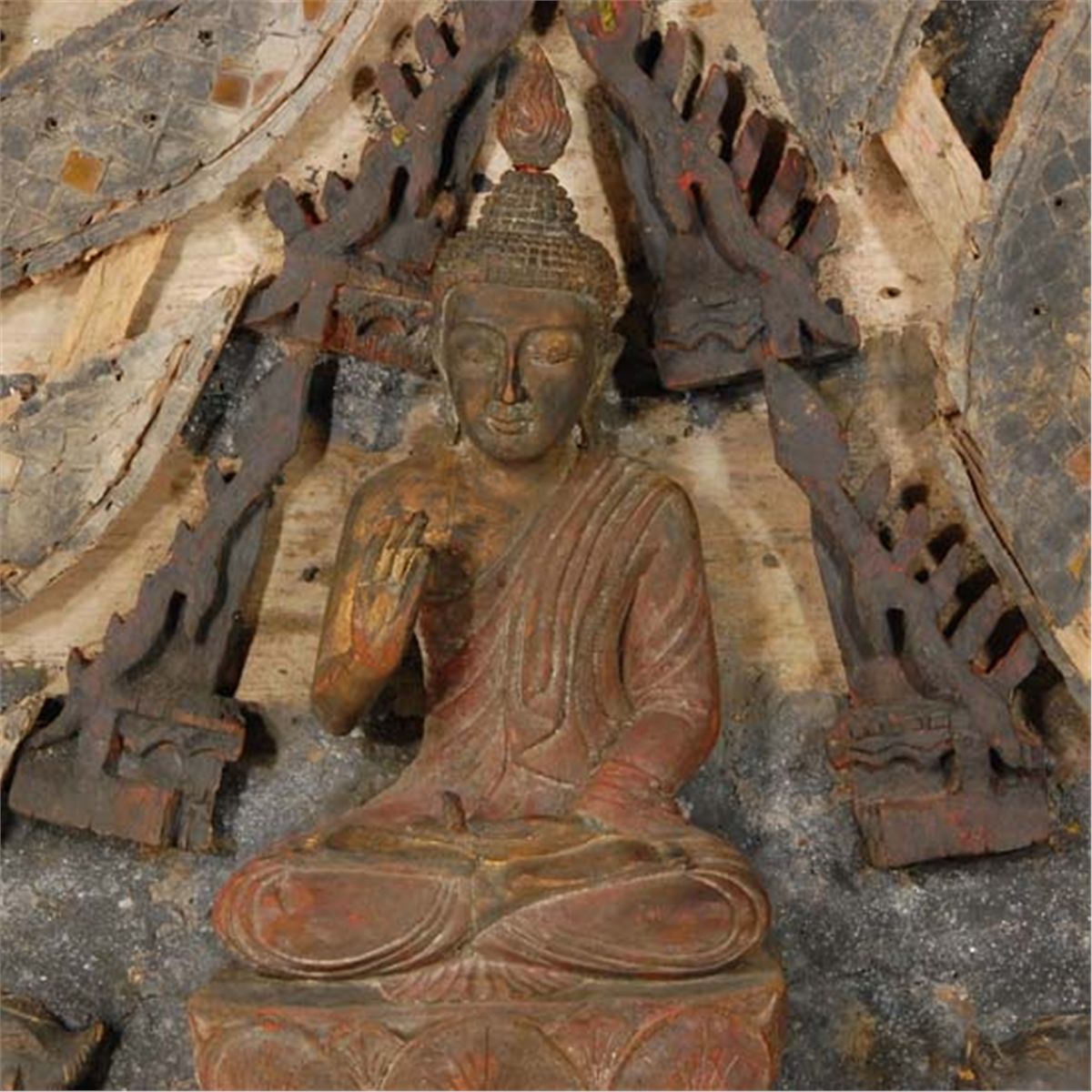 Excellent museum quality early 1900s original antique teak Thai Buddhist Temple roof gable end. The piece measures 64" x 45" x 4".Rare piece from renovation of Wat (Temple) Nong Tum in Northern Thailand. Gilded and ornately designed with seated Buddha on