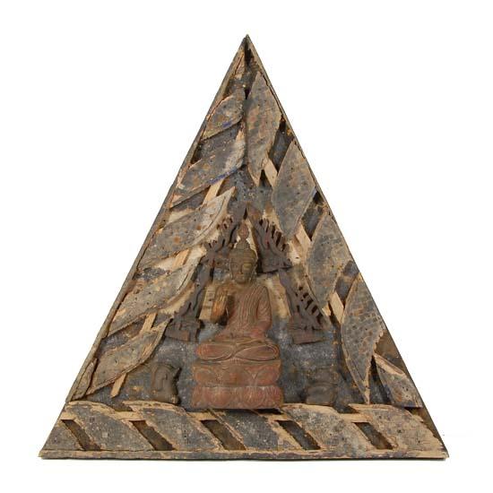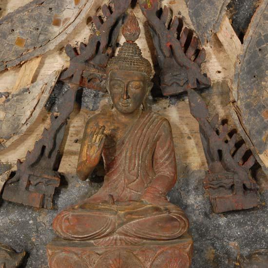 Excellent museum quality early 1900s original antique teak Thai Buddhist Temple roof gable end. The piece measures 64" x 45" x 4".Rare piece from renovation of Wat (Temple) Nong Tum in Northern Thailand. Gilded and ornately designed with seated Buddha on elephants center. These teak pieces rarely come up any longer. Most newer temples are built of concrete. Rare Antiquity Investment opportunity!