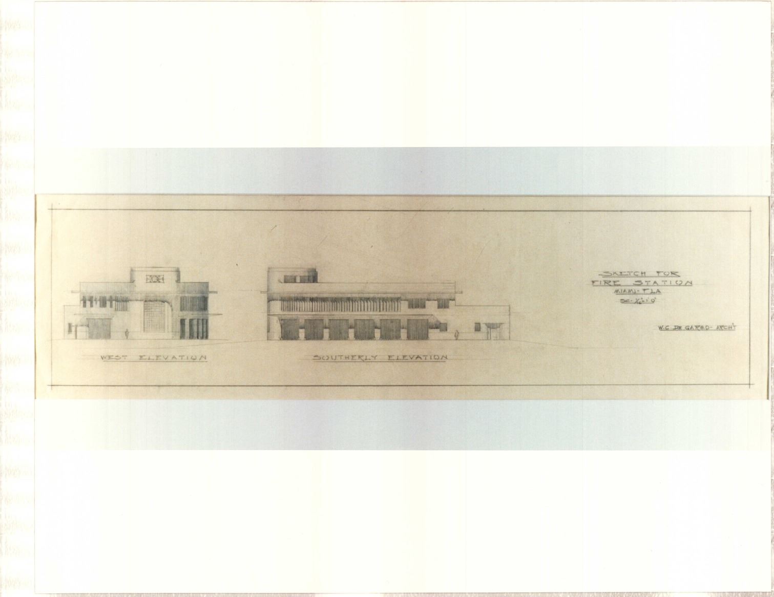 Gloss finished photographic print of an architectural sketch by American architect Walter DeGarmo, who was known for his Mission and Mediterranean revival style luxury residences in South Florida. Print features two sketched views of a modern styled firehouse with multiple bays and rounded exterior walls. This photograph is included in the 1991 book, 70 Years of Miami Architecture, by Millas J. Aristides, published by the Bass Museum of Art. Mounted on white matboard. Title and description labeled to back. Print size: 16"H x 20"W; with matboard: 22"H x 28"W.